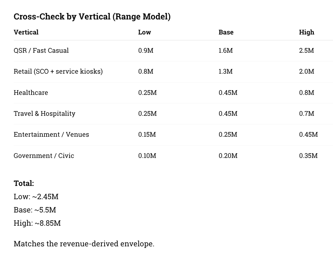 This range is defensible because it’s constrained by a public revenue anchor (kiosk market size) and uses transparent unit economics rather than unverifiable “we think there are X kiosks” claims.