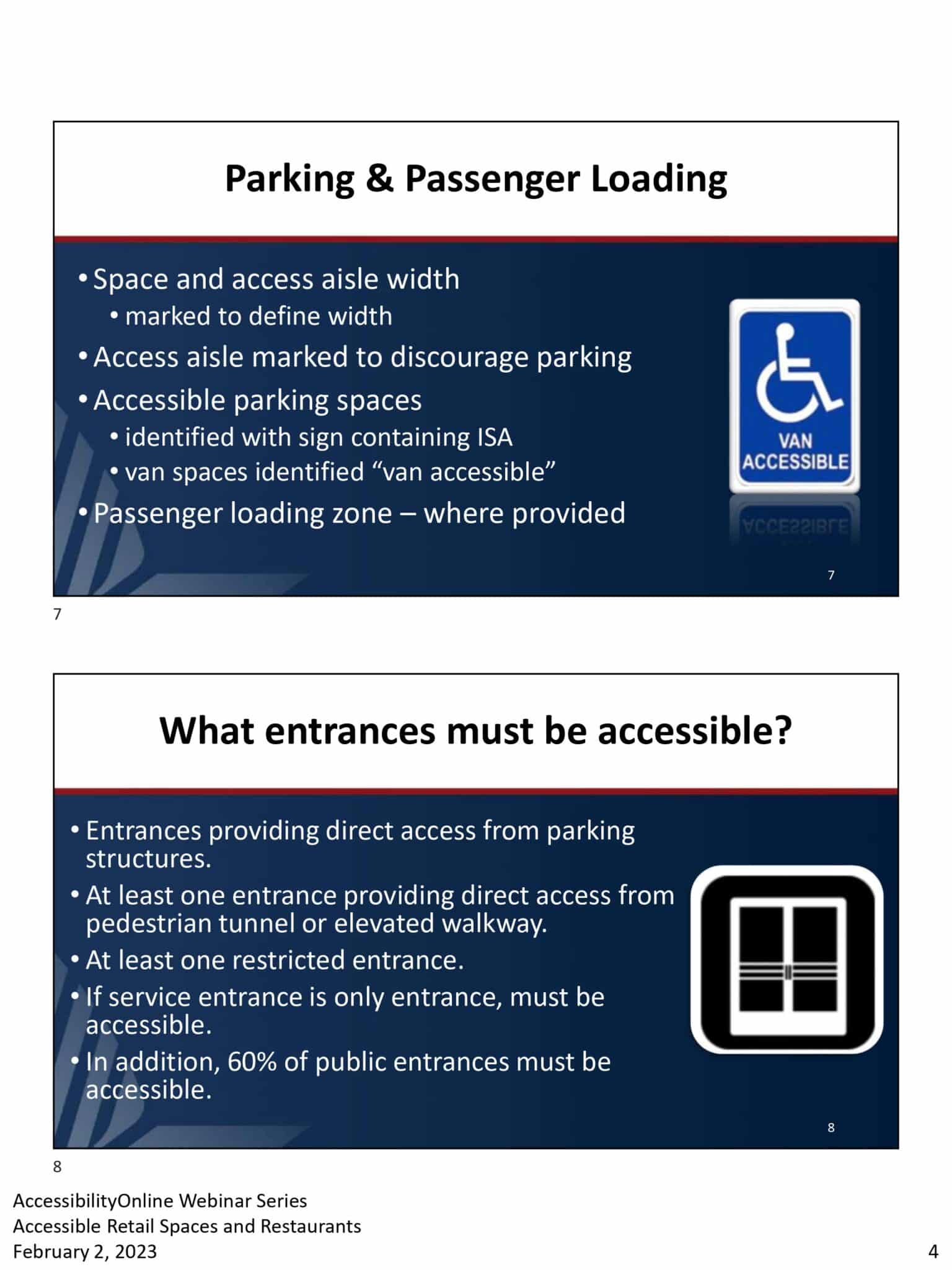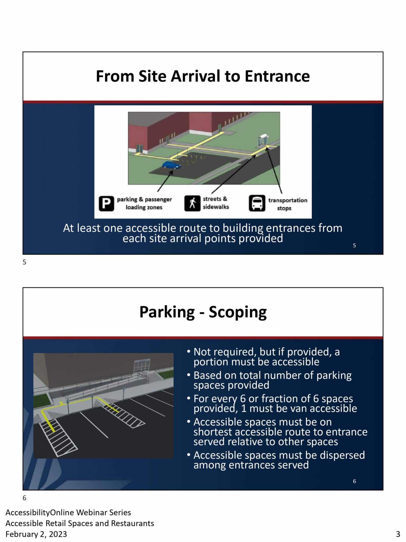 - Two slides: The first discusses ADA-compliant, accessible routes from site arrival to building entrances, with icons for retail and restaurant parking and transportation stops. The second slide details parking requirements, including accessible spaces and van accessibility criteria.