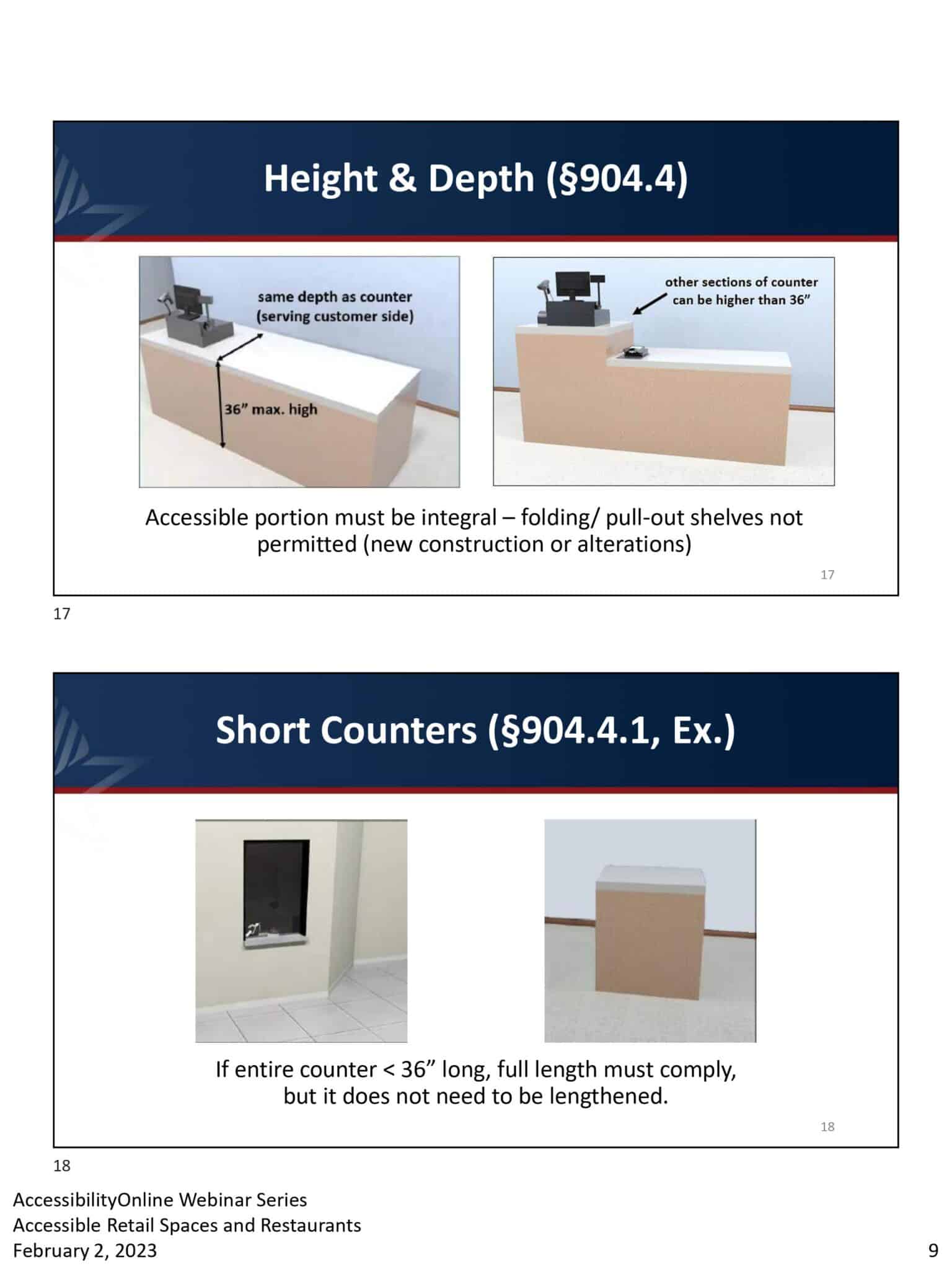 - Two slides discuss ADA compliance in retail restaurants. The first specifies an accessible counter section with a maximum height of 36 inches. The second shows a short counter example, explaining full-length compliance when the unit is less than 36 inches long.