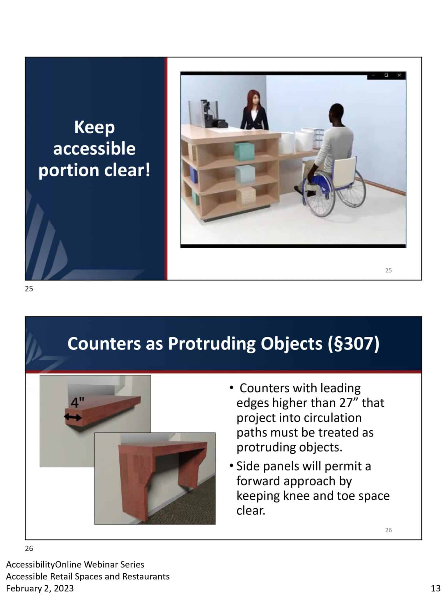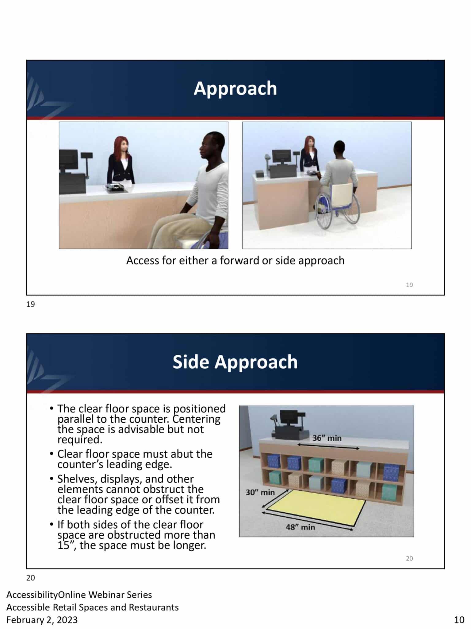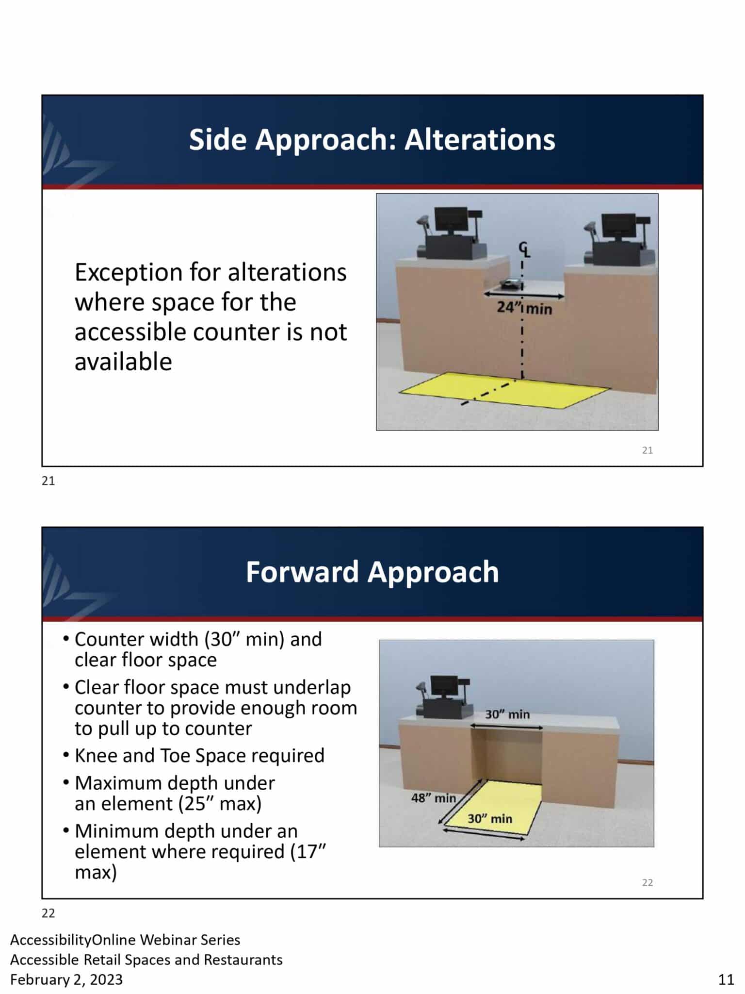 - Two slides showing diagrams of accessible counter approaches in ADA-compliant retail settings. The top slide details side approach alterations with specific measurements, while the bottom slide outlines the forward approach, including counter width, depth, and required knee and toe space for restaurants.