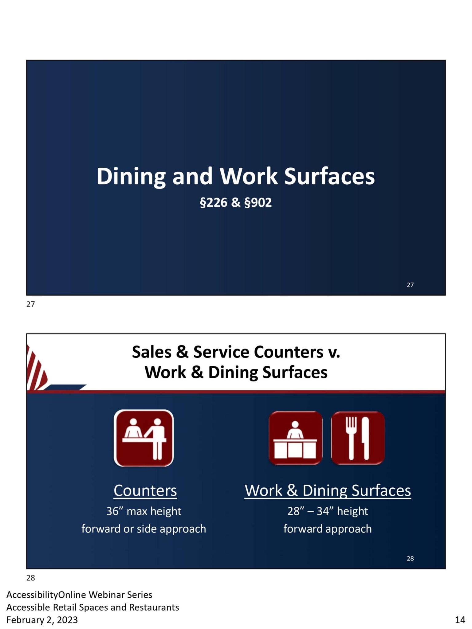 - Slide with two sections. Top: Dining and Work Surfaces §226 & §902 on a dark blue background. Bottom: Comparison of Counters and Work & Dining Surfaces with icons and measurements for ADA accessibility in retail restaurants. Text: AccessibilityOnline Webinar Series.