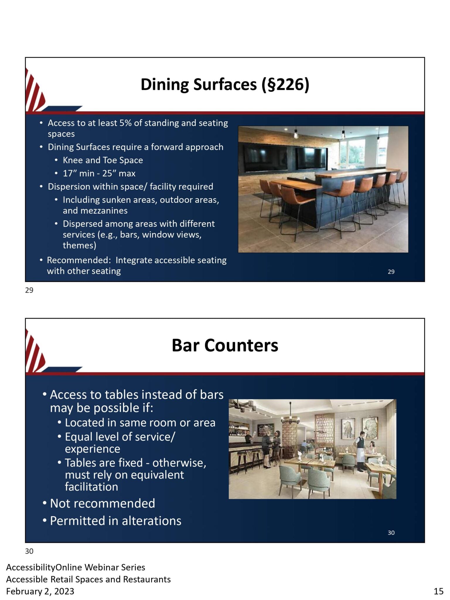 - Two slides about accessible dining surfaces and bar counters in ADA-compliant retail restaurants. They outline requirements for knee space, dispersion, and integration with other services for tables, mentioning specific accessibility considerations for bar counters.