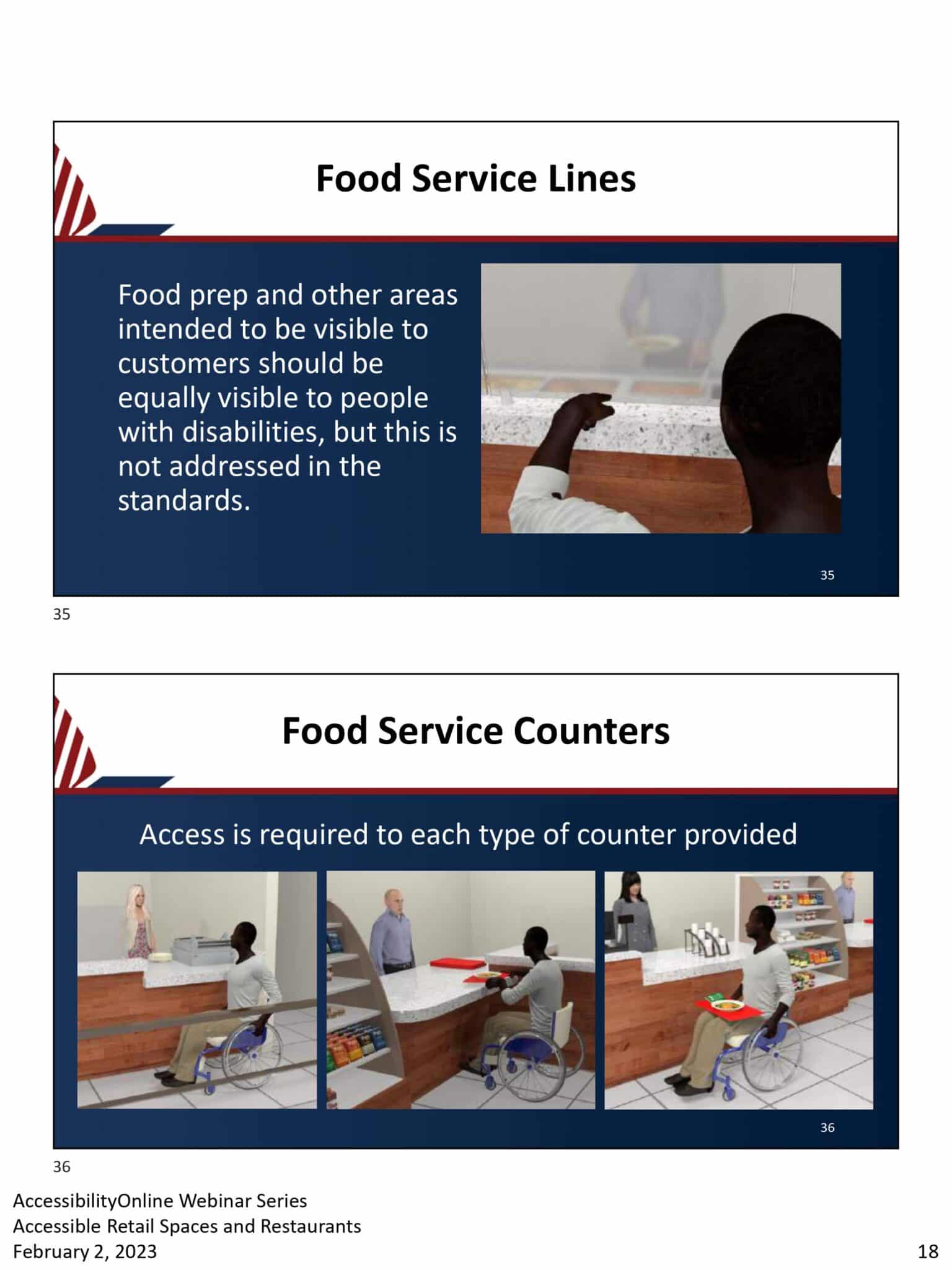- Slide 1 illustrates a man being served food from behind a counter, highlighting visibility standards in ADA-compliant retail spaces. Slide 2 features an employee helping a man in a wheelchair at the counter, emphasizing adherence to accessibility requirements in restaurants.