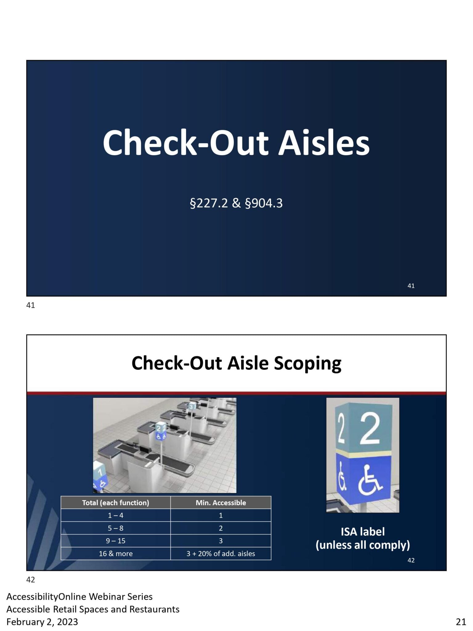 - Slide titled Check-Out Aisles with a section code. Below, a slide titled Check-Out Aisle Scoping displays check-out aisles data, an image of ADA-compliant check-out lanes in retail settings, and a sign with ISA label (unless all comply).