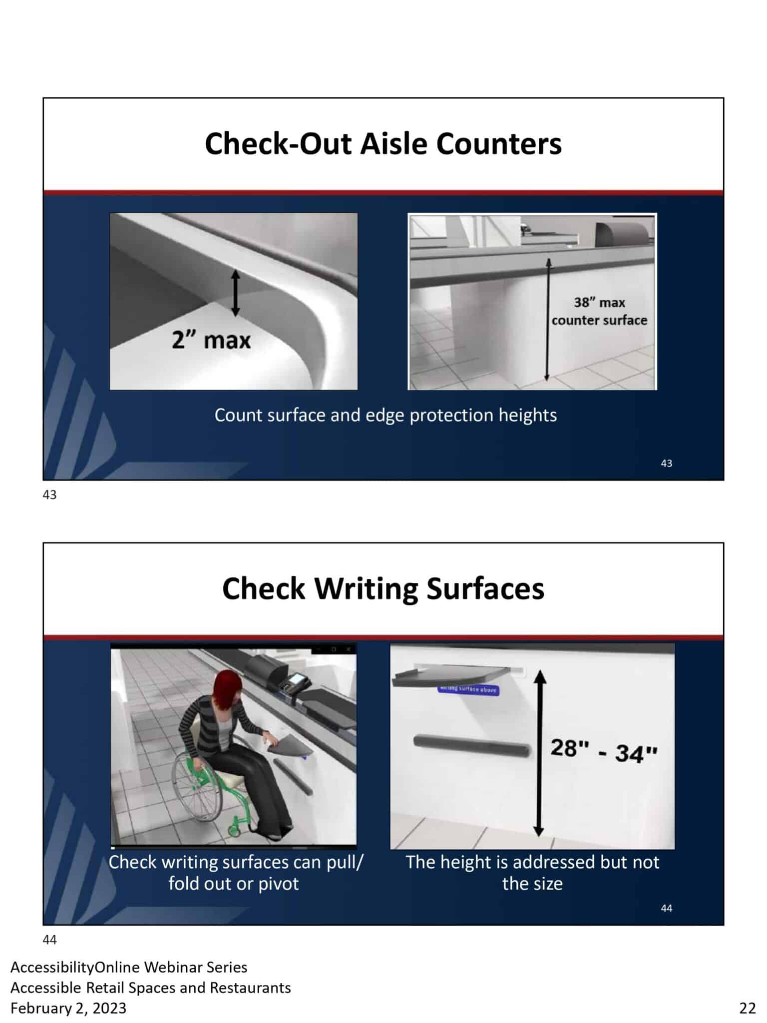 - A presentation slide designed for ADA-compliant retail environments displays checkout aisle counters and check writing surfaces with precise measurements. The top image highlights a 2 max edge protection and 38 max counter surface, while the bottom focuses on pull-out check writing surfaces at 28-34 height.