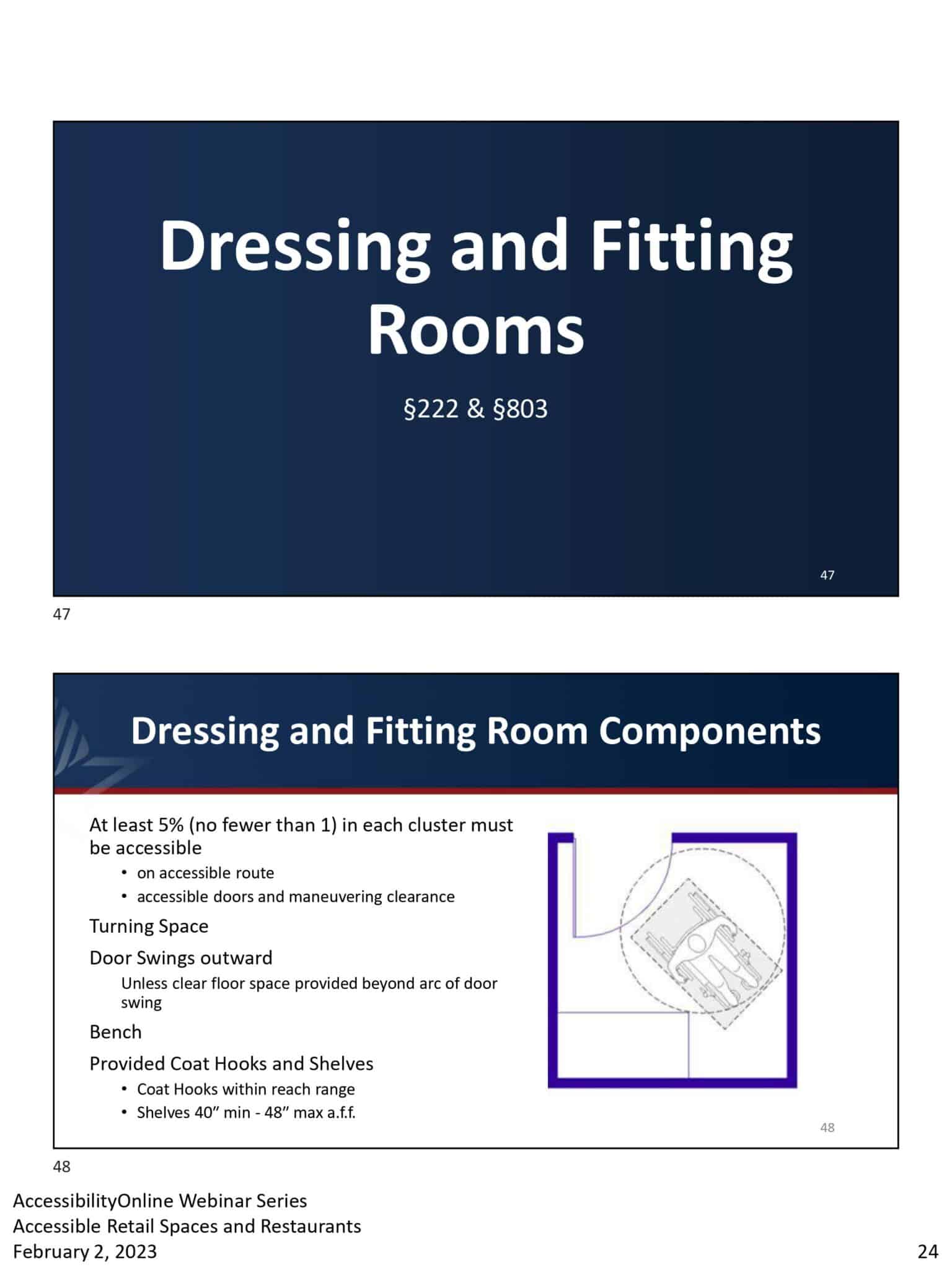 - A presentation slide titled Dressing and Fitting Rooms and Dressing and Fitting Room Components, includes ADA accessibility requirements for retail spaces. It covers door swing clearance, turning space, benches, hooks, shelves, and clear floor space.