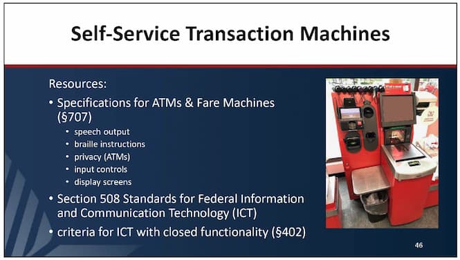 On transactional kiosks, the moderator mostly alluded to the new kiosk specific regulations that are expected from the U.S. Access Board. They will extract the relevant sections from the existing referenced guides + add in new ones.