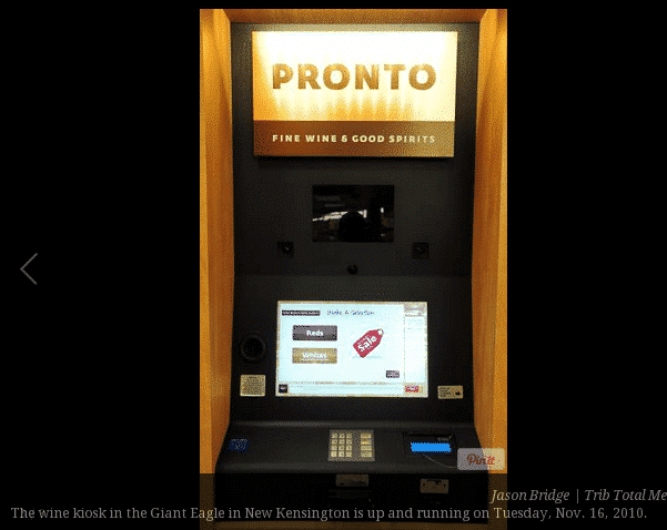 - A Pronto wine kiosk stands in Giant Eagle, New Kensington, featuring a touchscreen with options for red and white wines. The sleek wine kiosk display is highlighted in a caption dated November 16, 2010.
