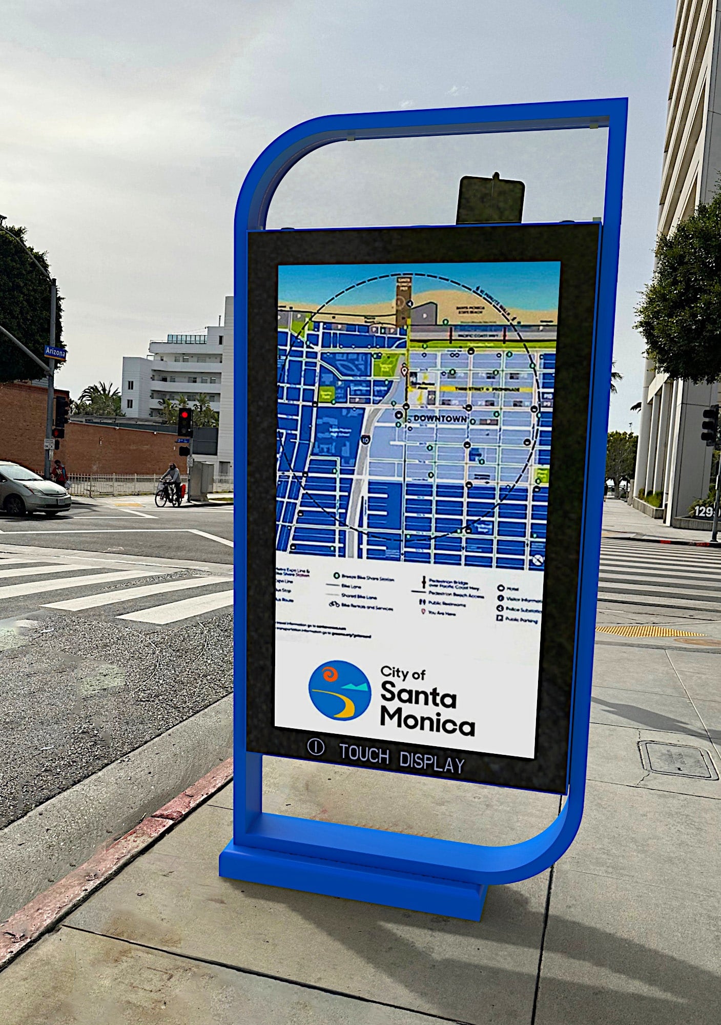 - Nestled on a Santa Monica sidewalk, this digital street map kiosk boasts the best kiosk design with its sleek blue frame. It features a touch display showcasing downtowns layout, complete with a You Are Here marker near crosswalks and surrounding buildings.