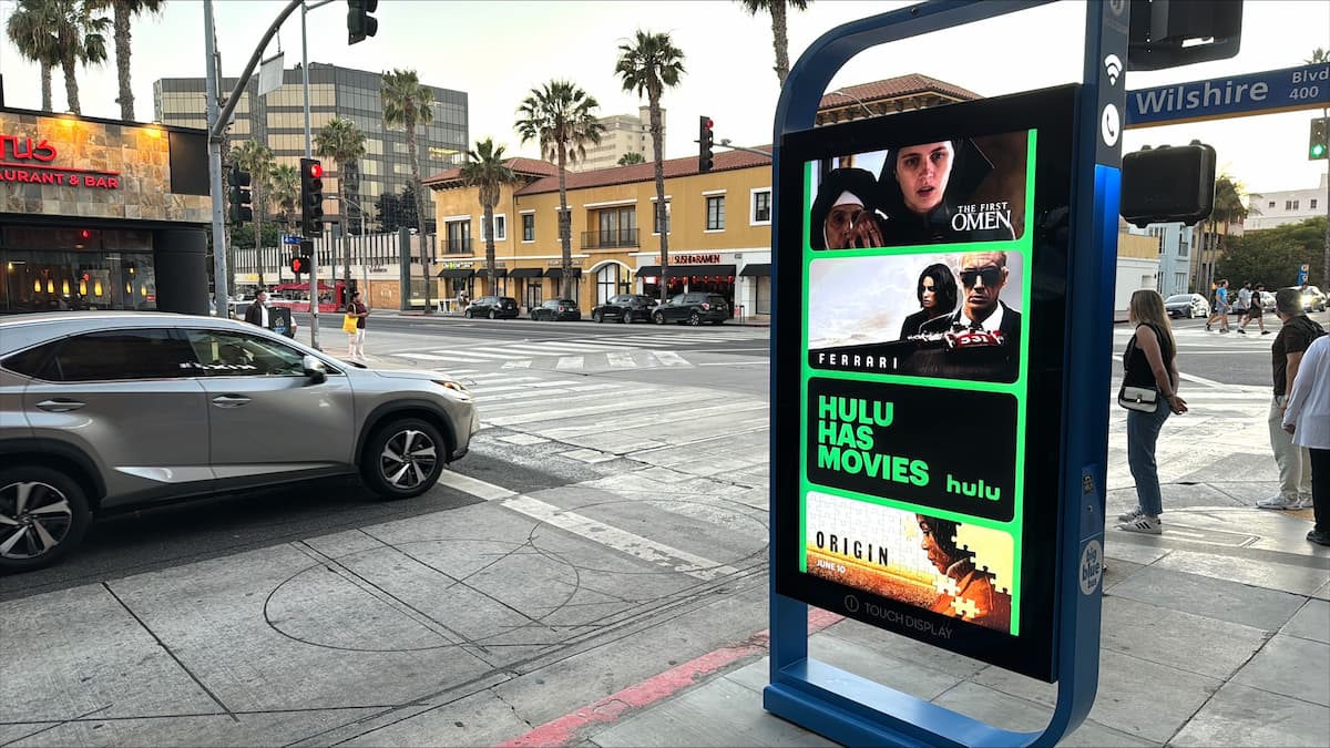- A digital display on a city street corner showcases Hulus movie lineup, featuring Ferrari, The Omen, and Vacation Friends 2. A car idles at the traffic light. With its sleek aesthetic and prime placement, this may be the best kiosk design amid buildings and palm trees.