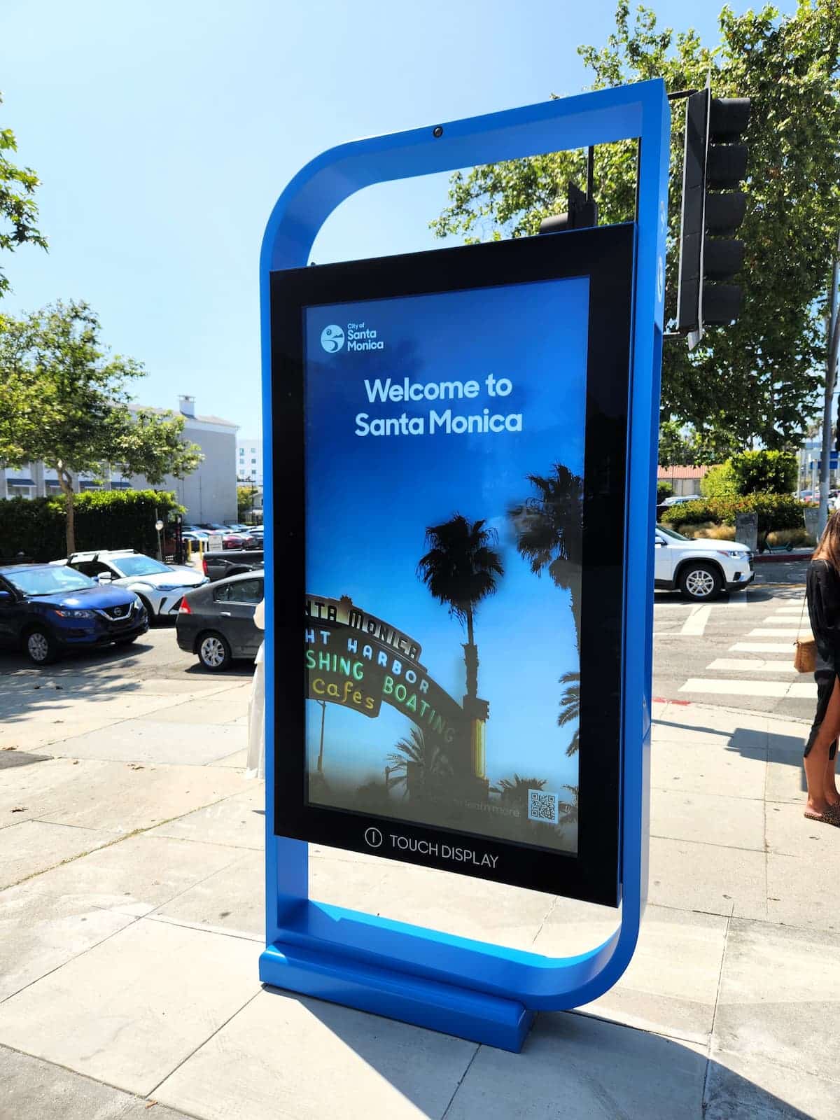 - A digital sign on a city sidewalk, exemplifying the best kiosk design, warmly displays Welcome to Santa Monica. In the background, palm trees sway near signs for a fishing and boating café. Cars, a traffic light, and a pedestrian crossing complete the scene under a clear blue sky.