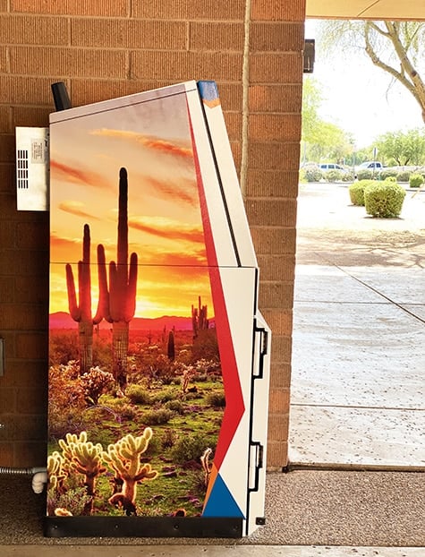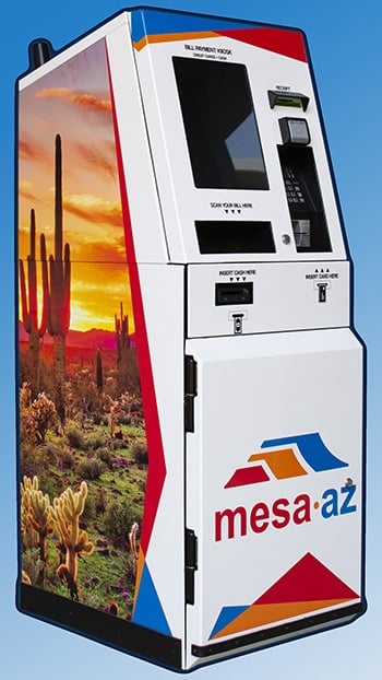 - A kiosk machine with a desert landscape design, featuring cacti and a sunset, serves as a convenient payment station. Mesa-AZ is printed on the front. Its situated next to a brick wall and near a glass door, cleverly integrating style with function.