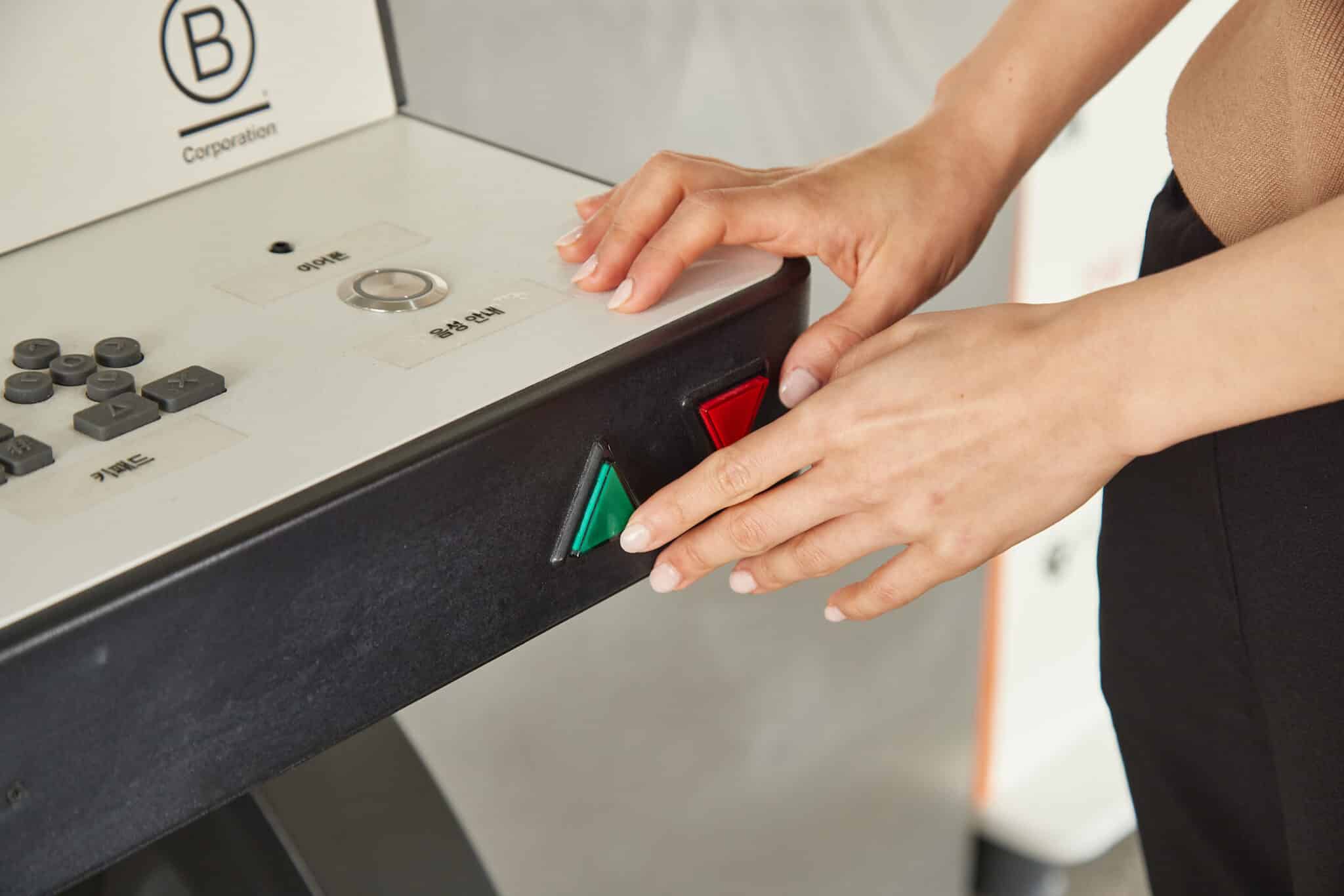 - A person pressing a green button on a machine equipped with several buttons and switches, alongside a braille tablet. The panel includes a red button and a display with Korean text. The individual is wearing a beige top and black pants.