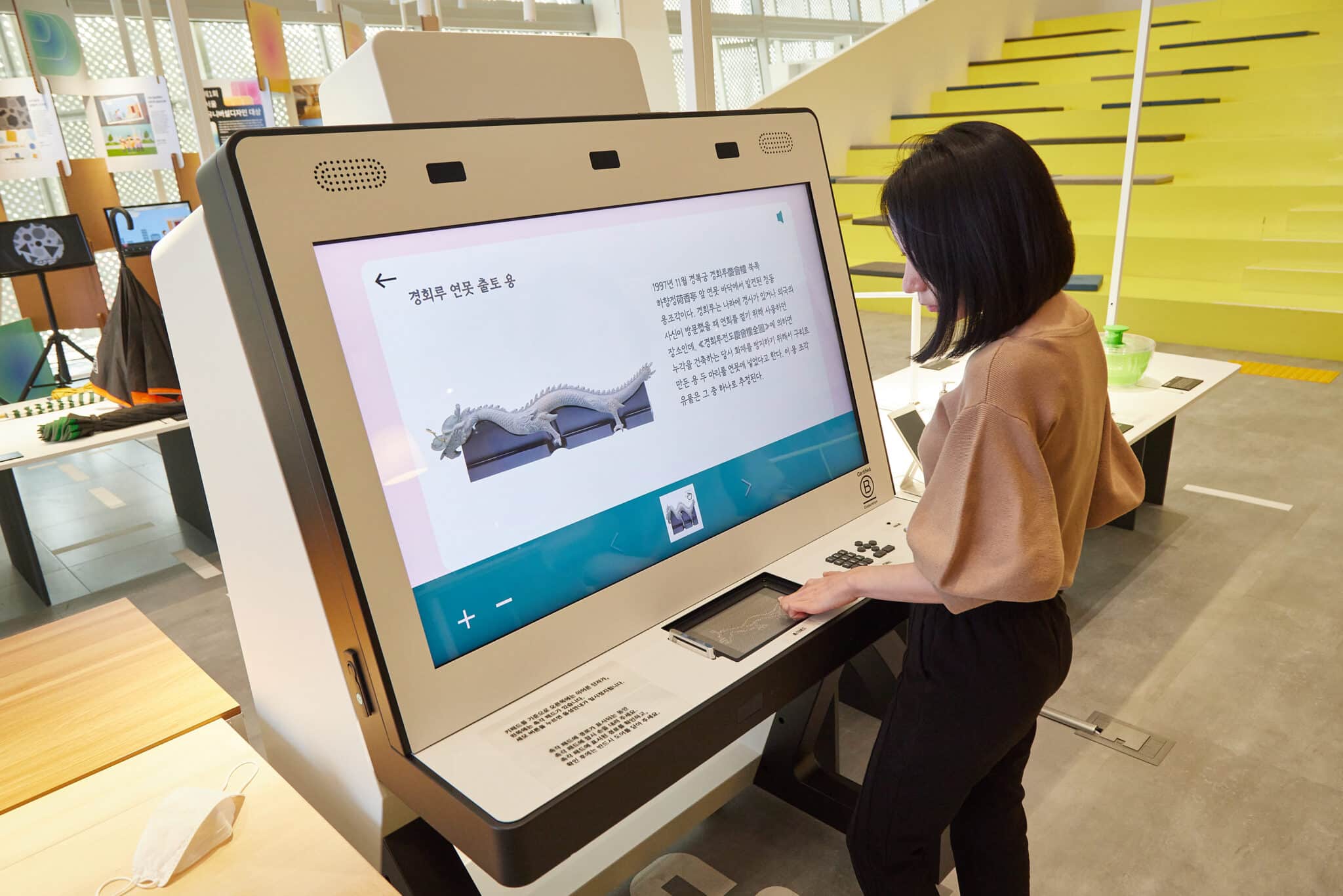 - A person stands at a large interactive touch screen kiosk, engaging with content that seamlessly transitions from digital images of a dragon to tactile elements akin to a Braille tablet. The modern setting features yellow steps in the background, enhancing the vibrant atmosphere.