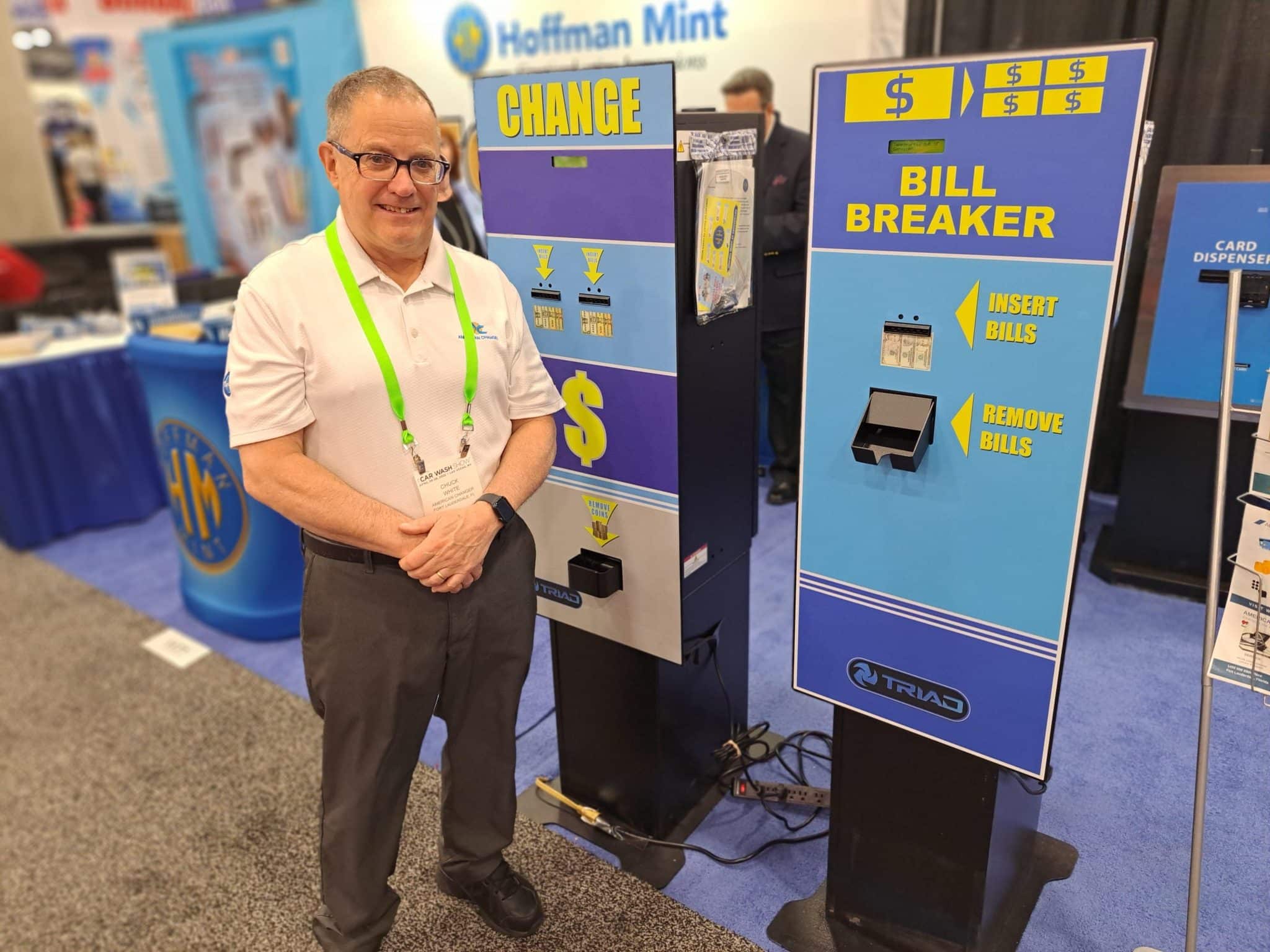 - A man in a white shirt and green lanyard stands next to two blue vending machines labeled CHANGE and BILL BREAKER at a carwash trade show tour.