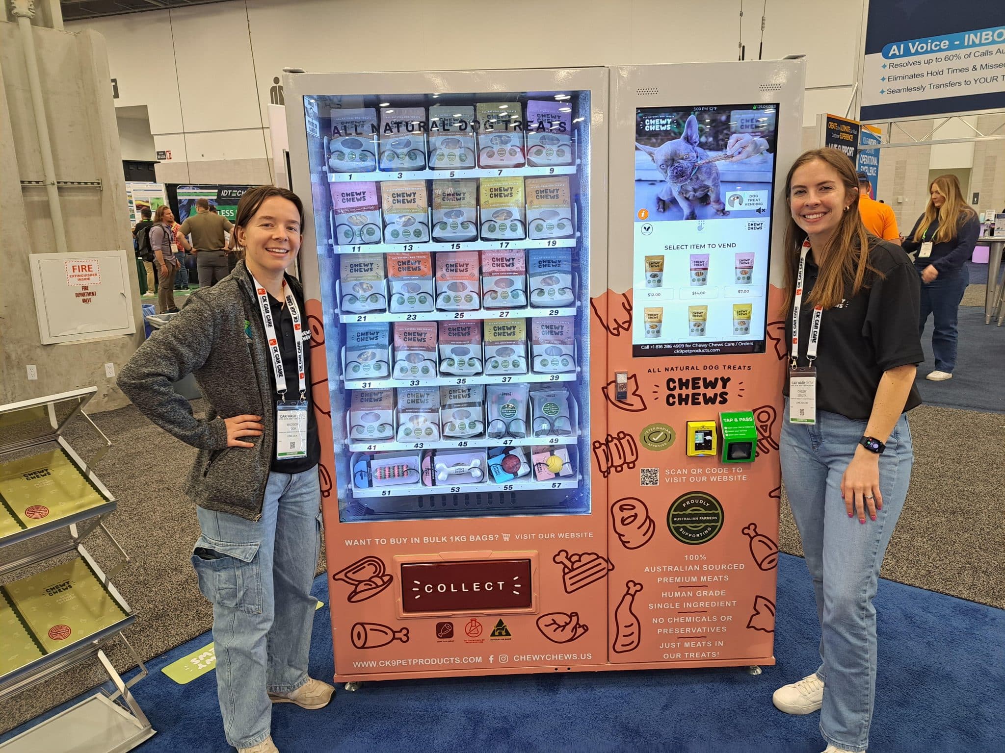 - Two women stand smiling next to a vending machine filled with pet treats at a carwash trade show tour. The machine is decorated with colorful labels and images of animal snacks, featuring a digital display and branding on the front.