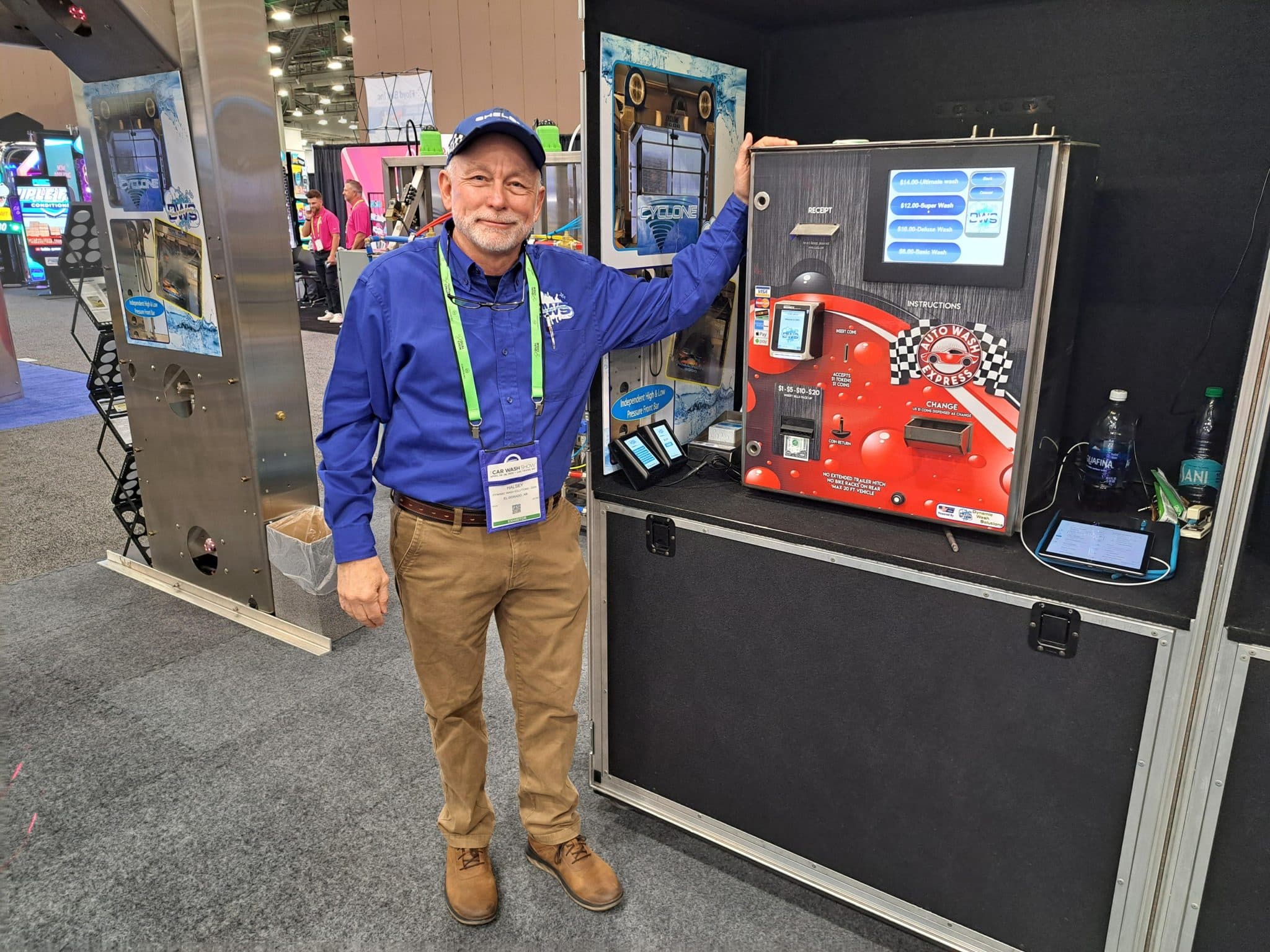 - A man in a blue shirt and cap stands smiling next to a red vending or arcade machine at a carwash trade show. Wearing a badge, he is surrounded by other displays and equipment, ready to give visitors a tour of the booth area.