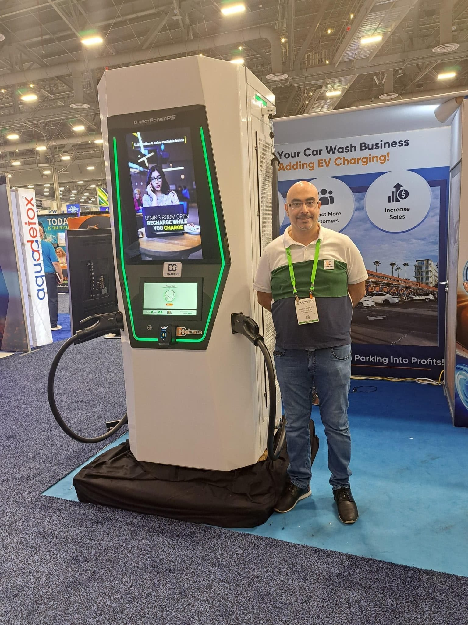 - A person stands smiling next to a large electric vehicle charging station at an indoor expo, part of a carwash trade show tour, with informational banners and booths visible in the background.