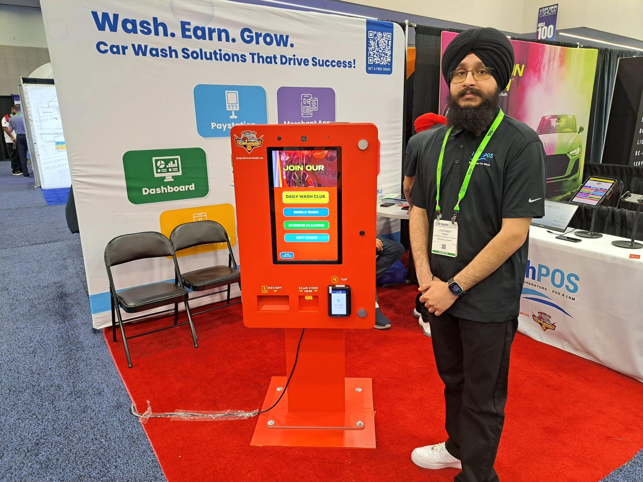 - A man in a black turban and shirt stands next to a bright red digital kiosk at a carwash trade show tour booth promoting wash solutions. The screen displays options, with informational banners visible in the background.