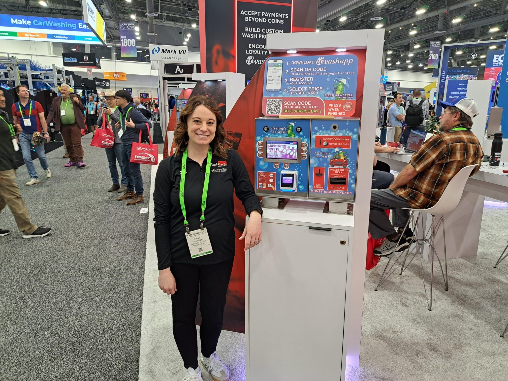- A woman in a black shirt stands smiling next to a large touchscreen kiosk at a carwash trade show. The kiosk displays WashApp and various washing service options, while other attendees and booths are visible in the background.