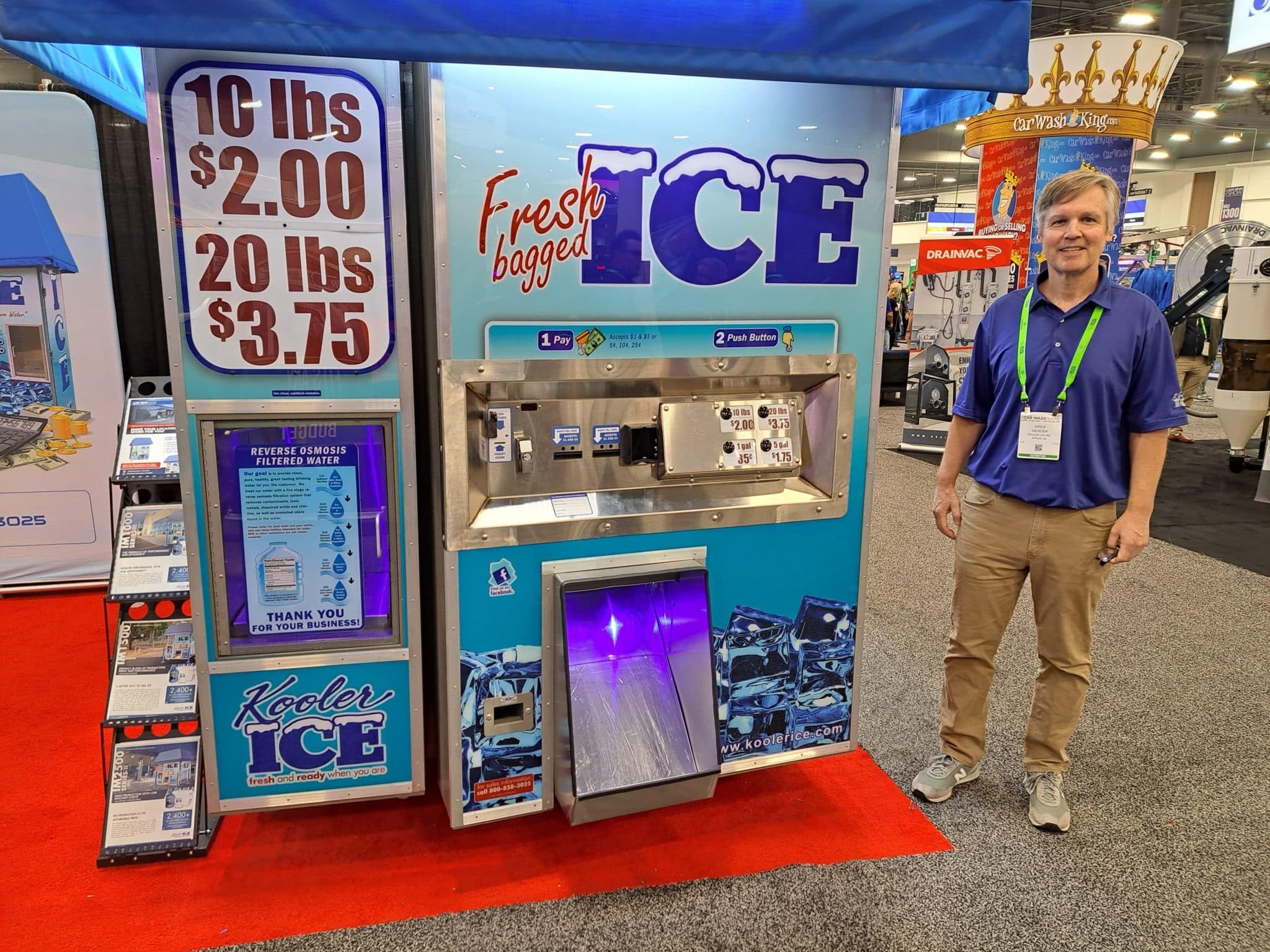 - A man stands next to a large ice vending machine with Fresh Bagged ICE signs and prices for 10, 20, and 30 lbs. The booth is set up in an indoor exhibition space during a carwash trade show tour.