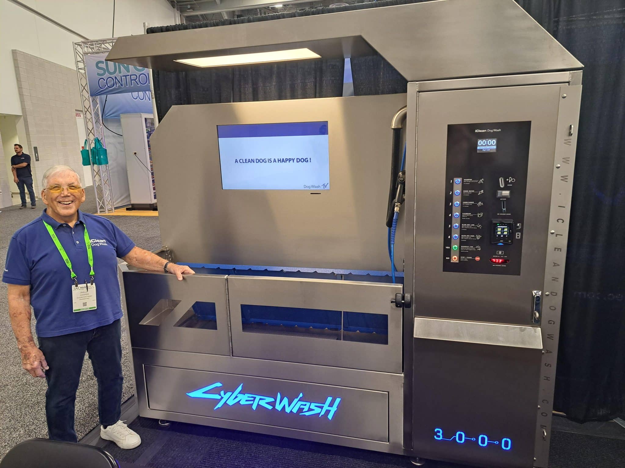 - An elderly man smiles next to a large, high-tech dog washing machine labeled CYBERWASH 3000 at a carwash trade show. A screen on the machine displays the message, A CLEAN DOG IS A HAPPY DOG!.