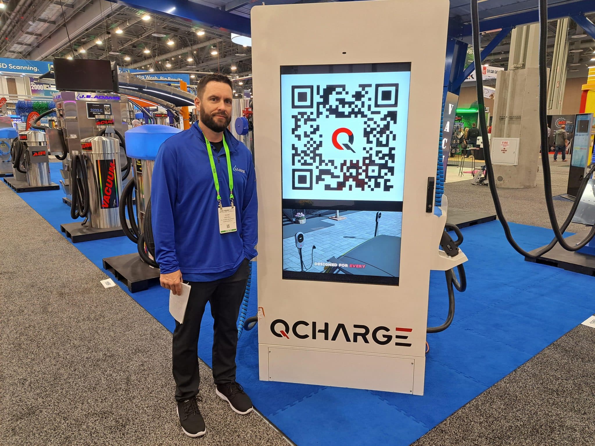 - A man stands next to a QCharge electric vehicle charging station displaying a large QR code on its screen at a carwash trade show. The background features charging equipment and booths on a blue carpeted floor.