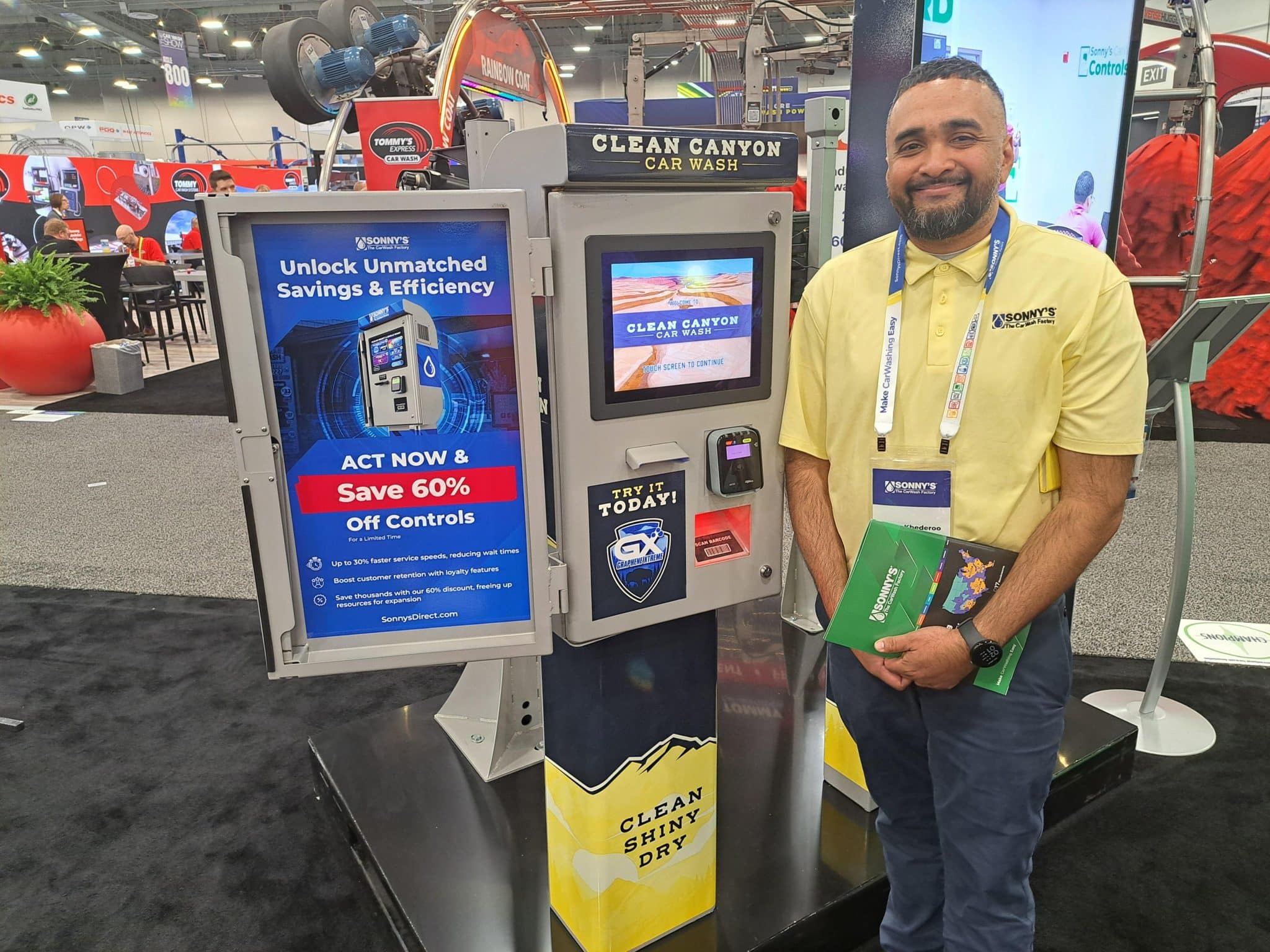- A smiling man in a yellow shirt stands next to a car wash payment kiosk with promotional signage offering 60% off controls at a carwash trade show tour booth.