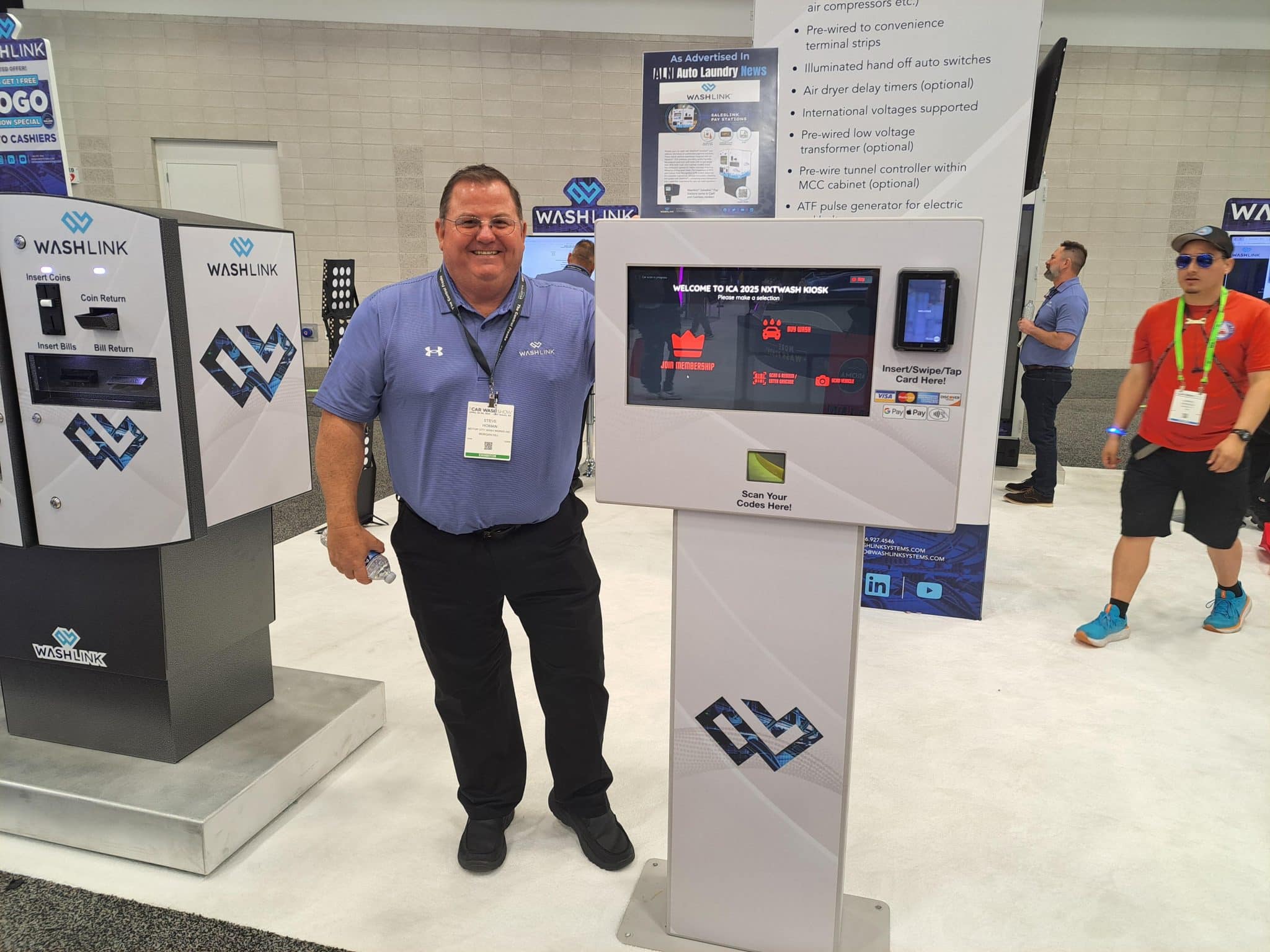 - A smiling man in a blue shirt stands beside a touchscreen kiosk at a carwash trade show booth for WASHLINK. The booth displays various equipment and branding, while other attendees tour the exhibition in the background.