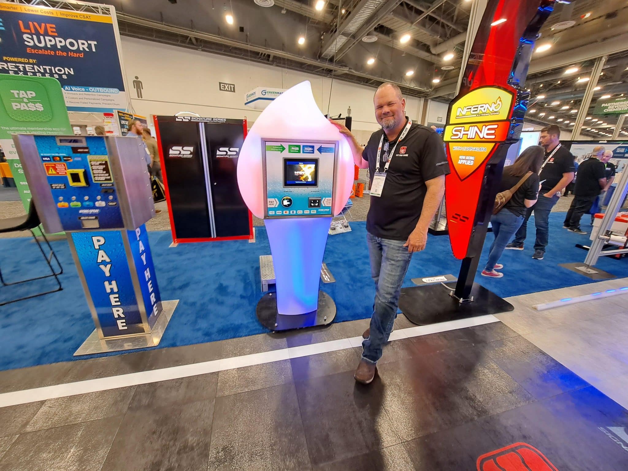 - A man stands smiling beside a futuristic touchscreen kiosk at a carwash trade show tour, surrounded by colorful equipment displays and banners in a spacious exhibition hall.