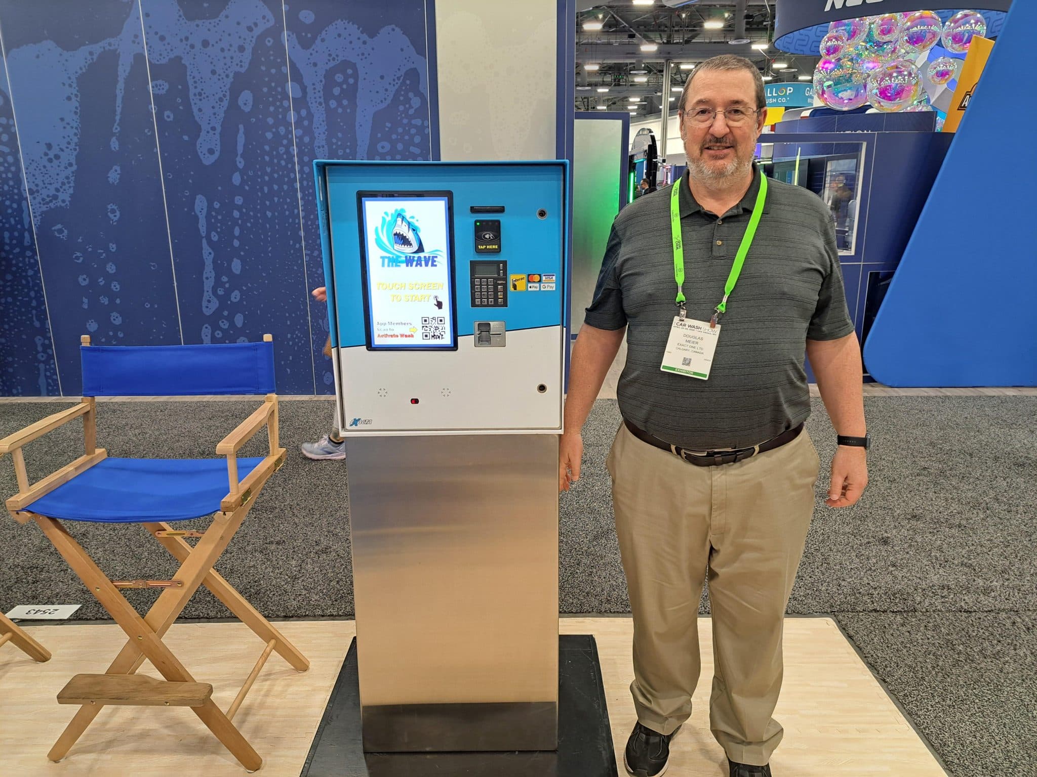 - A man with glasses and a green lanyard stands next to a blue and white kiosk called The Wave at a carwash trade show. A wooden director’s chair is nearby in the booth, capturing the energy of this industry tour.