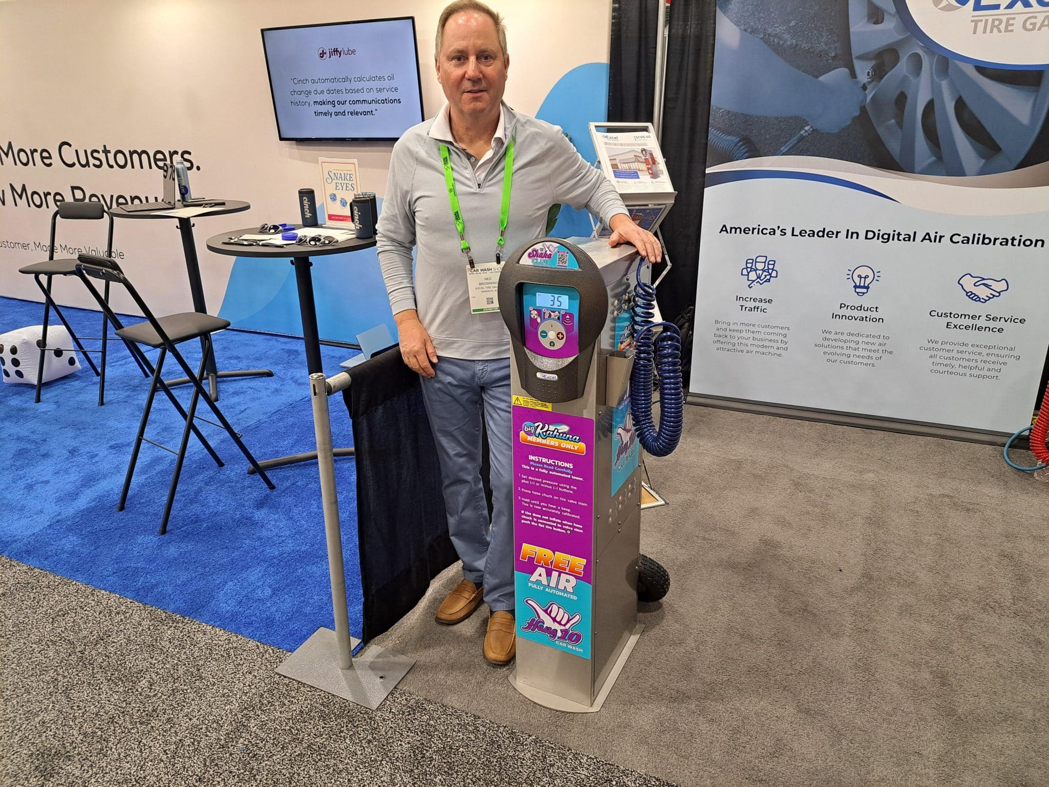 - A man stands at a carwash trade show booth next to a digital air calibration machine for tires. The booth showcases banners and promotional materials about tire care, air calibration services, and details of their trade show tour.