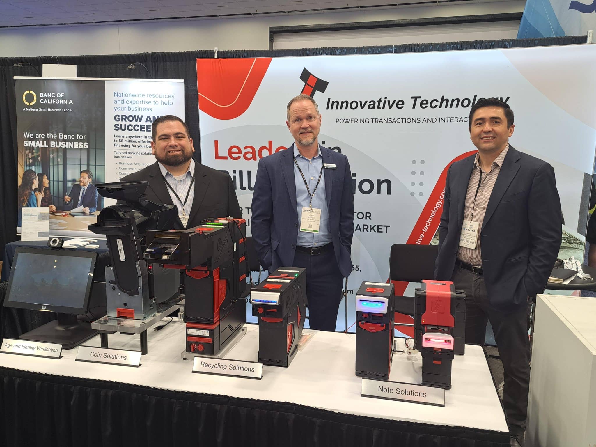 - Three men in business attire stand behind a booth displaying coin and note recycling machines at a technology expo, part of the carwash trade show tour. A banner for Innovative Technology is visible behind them, along with other promotional materials.
