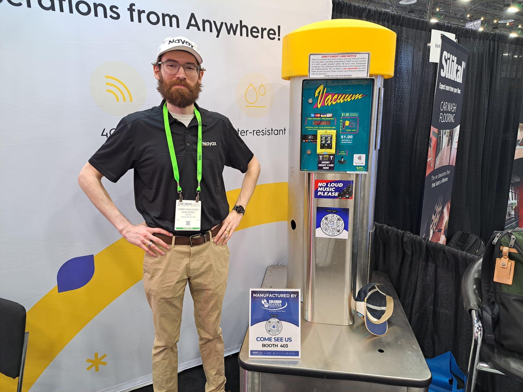 - A man in a blue shirt and cap stands smiling next to a red vending or arcade machine at a carwash trade show. Wearing a badge, he is surrounded by other displays and equipment, ready to give visitors a tour of the booth area.