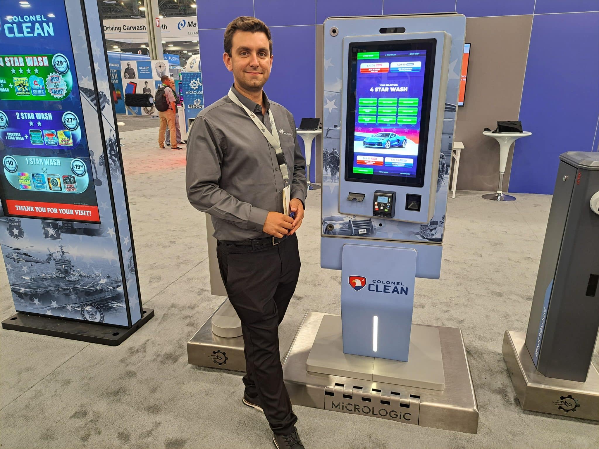 - A man in business attire stands smiling beside a tall touchscreen kiosk labeled Colonel Clean at a carwash trade show booth. The kiosk displays a car wash menu and payment options, with informational displays highlighting the tour in the background.