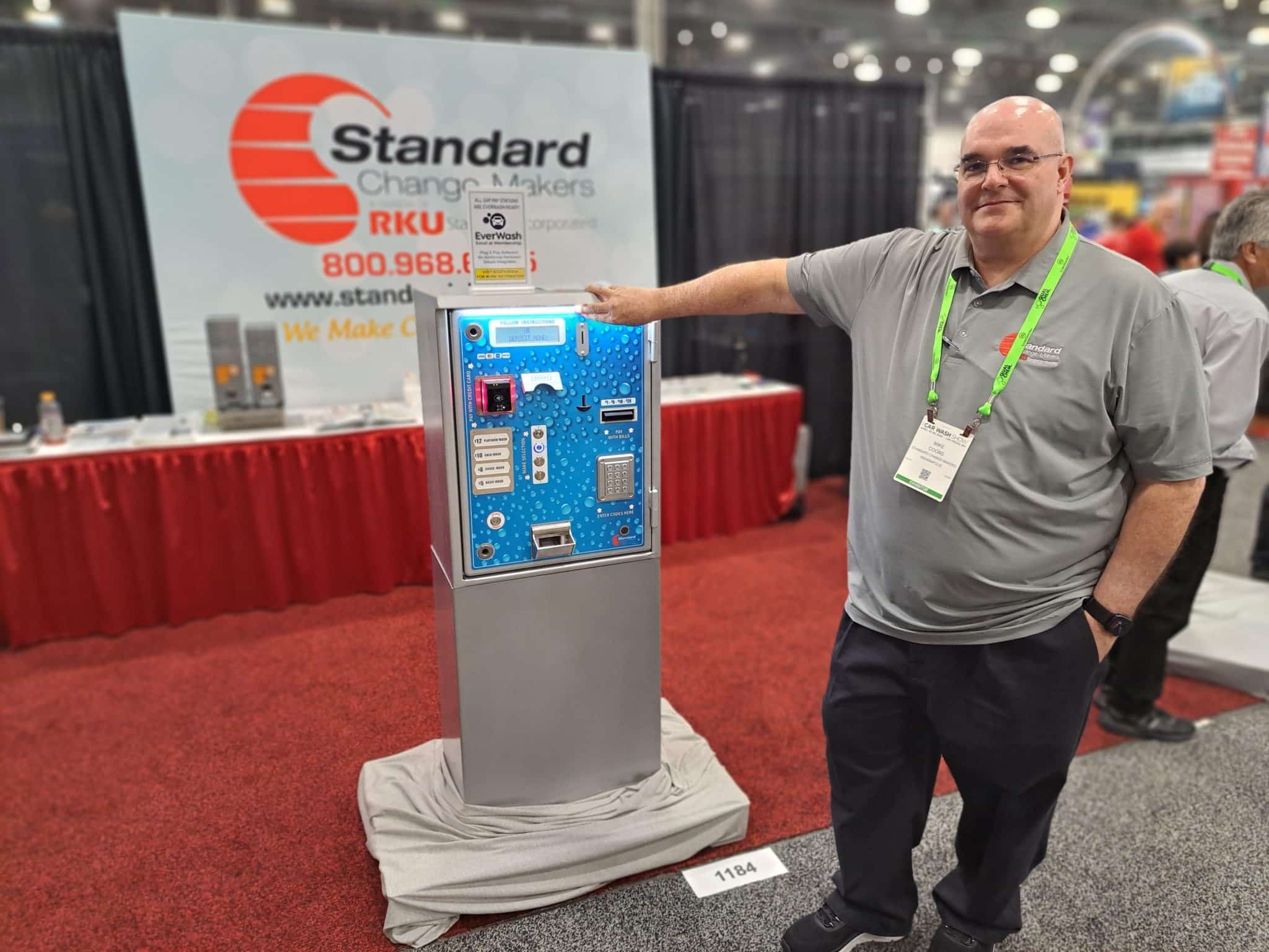 - A man in a gray shirt and glasses stands smiling next to a change machine display at a carwash trade show. The booth behind him has a Standard Change-Makers banner and informational materials on a red and white table.