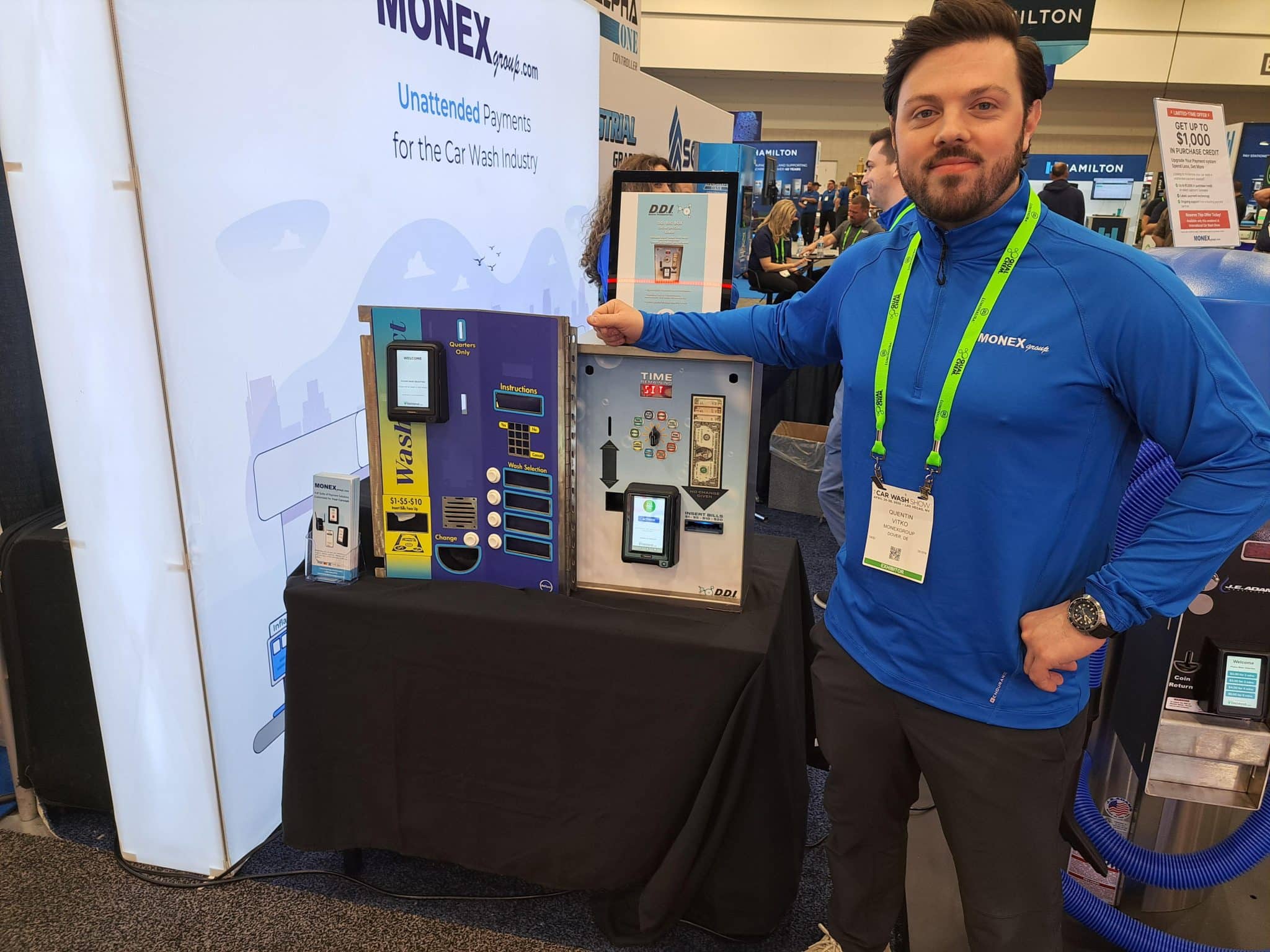 - A man in a blue MONEX shirt stands next to a display of payment terminals and control panels at a carwash trade show booth. He is smiling and has one hand resting on the display table, ready to welcome visitors on the trade show tour.