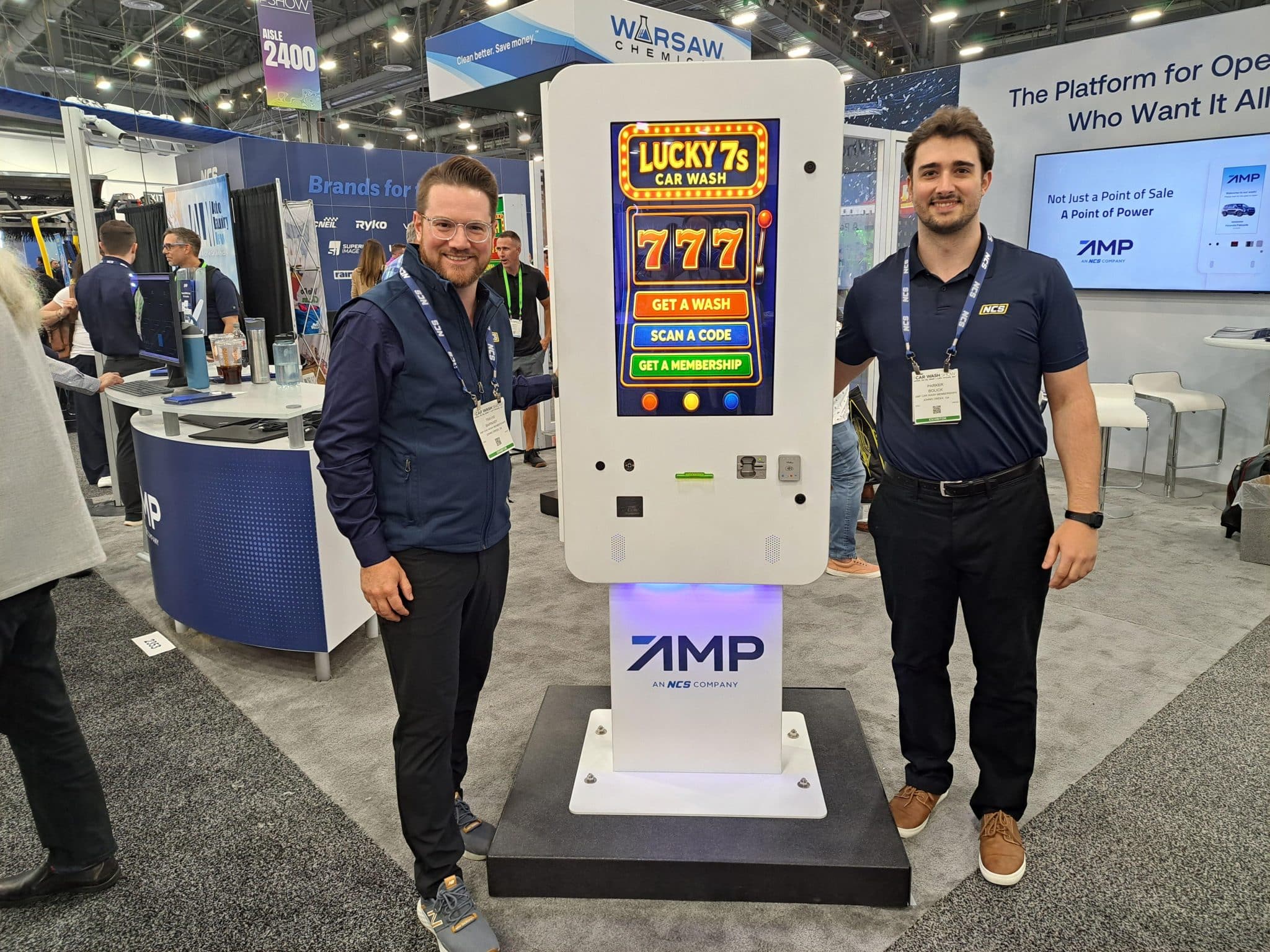- Two men stand beside a white kiosk with a Lucky 7s Car Wash slot machine display at a carwash trade show booth. Both are smiling, wearing badges, and the booth features banners and promotional materials in the background.