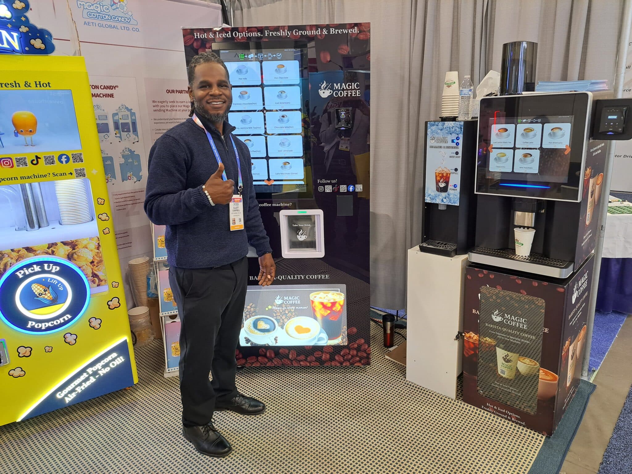 AETI Global, a provider of food and beverage vending machines, demonstrated its Magic Coffee Series machines, including the MCF Vending Pro, which serves more than 10 hot beverage options, including coffee, latte, cappuccino and hot chocolate.