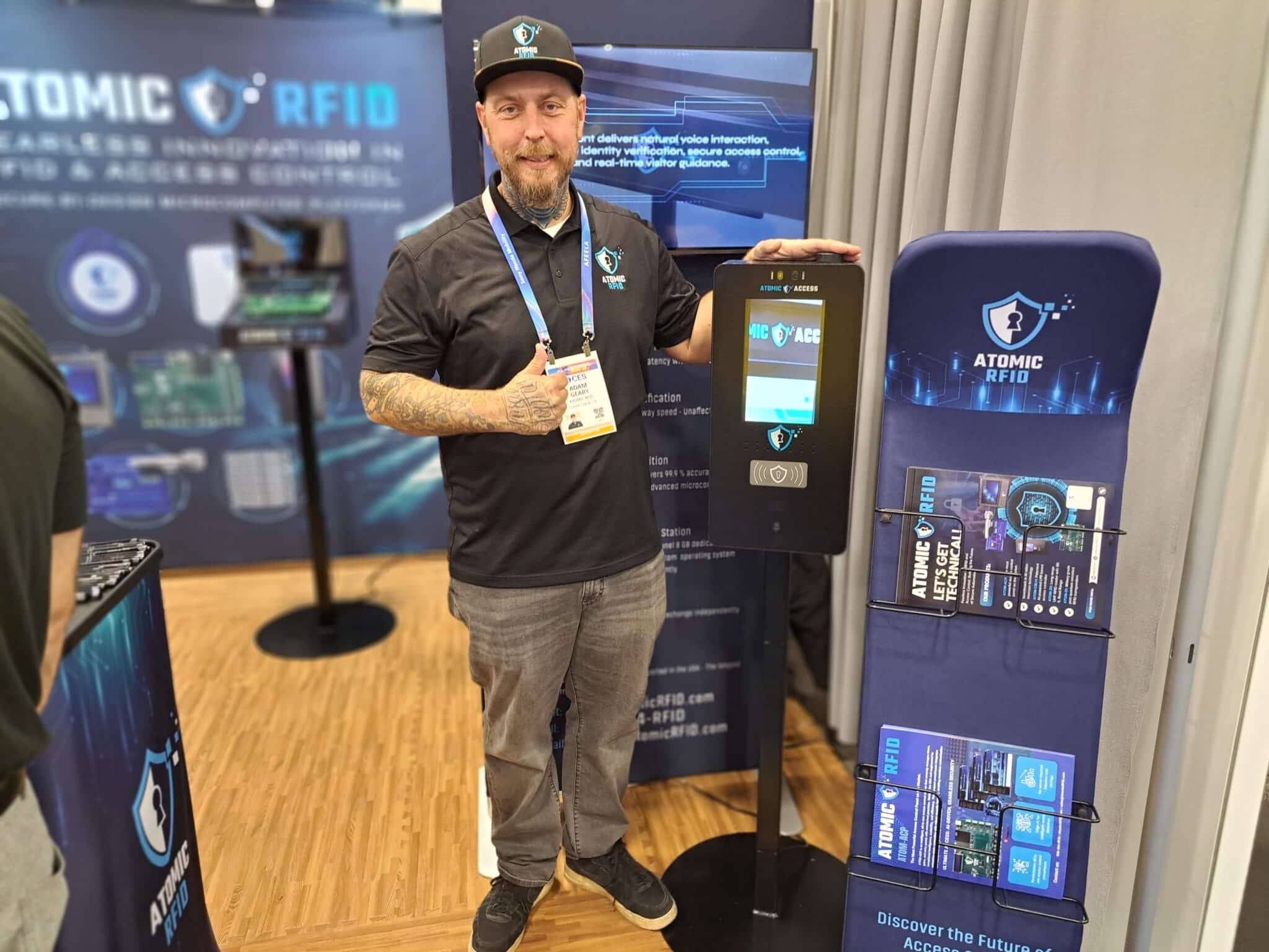 - Adam Geary presents the touchscreen intercom kiosk for access control at the Atomic RFID exhibit.