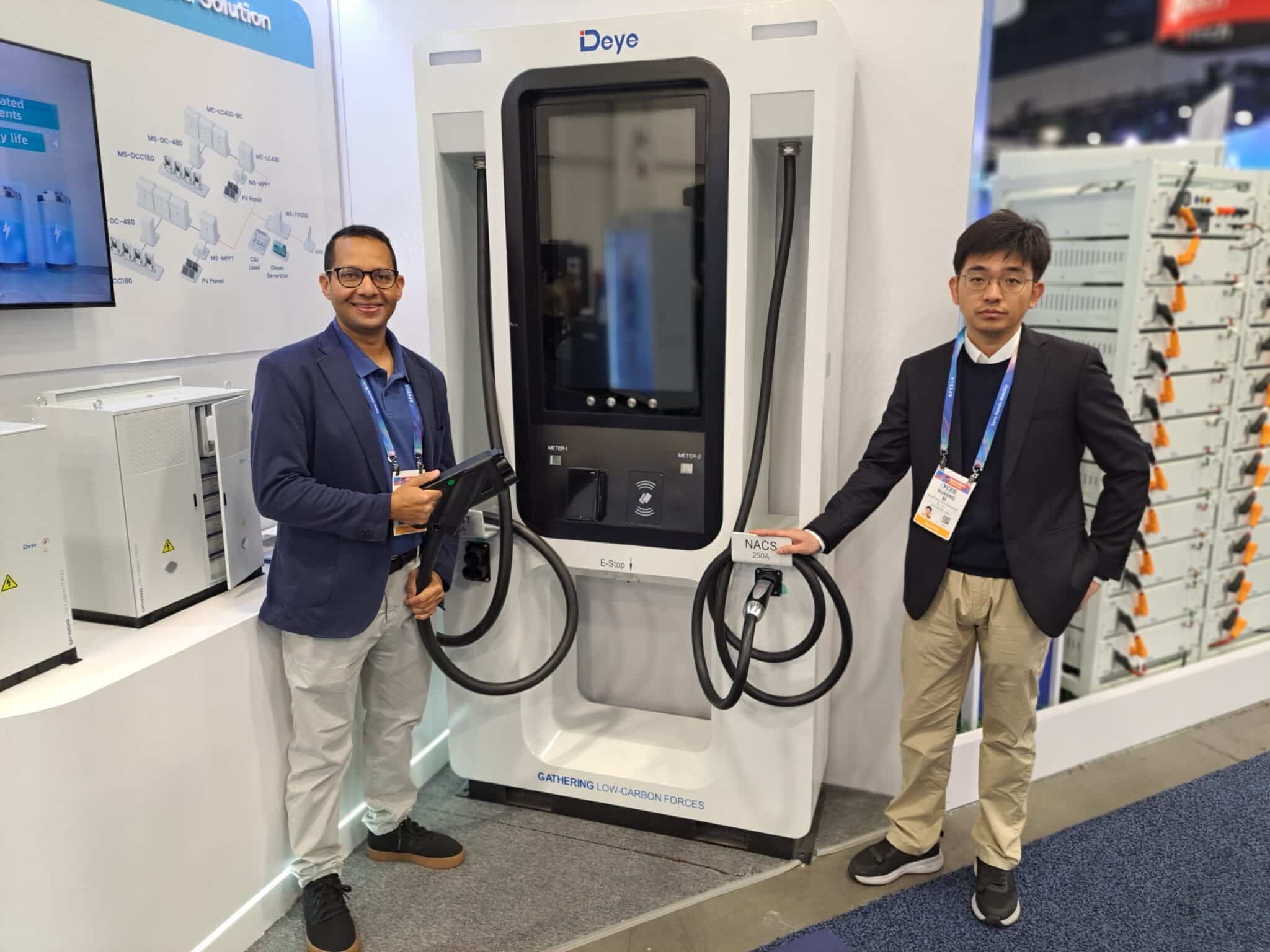 - Wilson Ventura and Ruifeng Bi present the Smart EV Charger at the Deye exhibit.