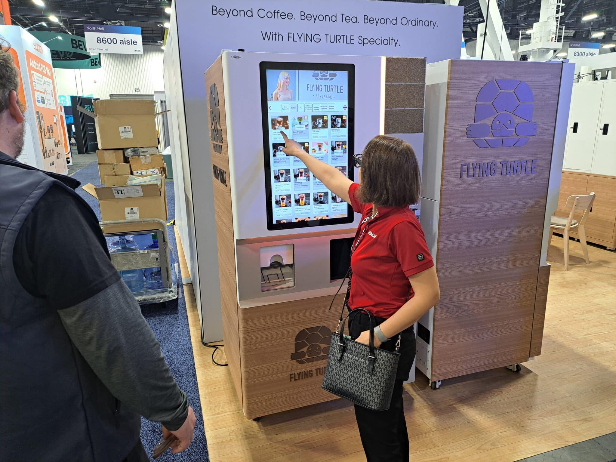 - A customer places a coffee order at the Flying Turtle vending machine.