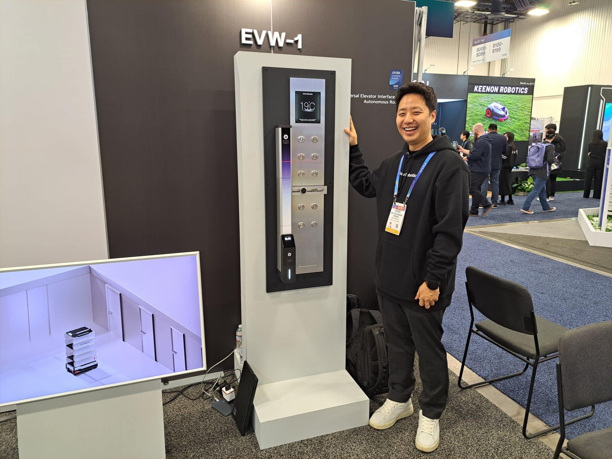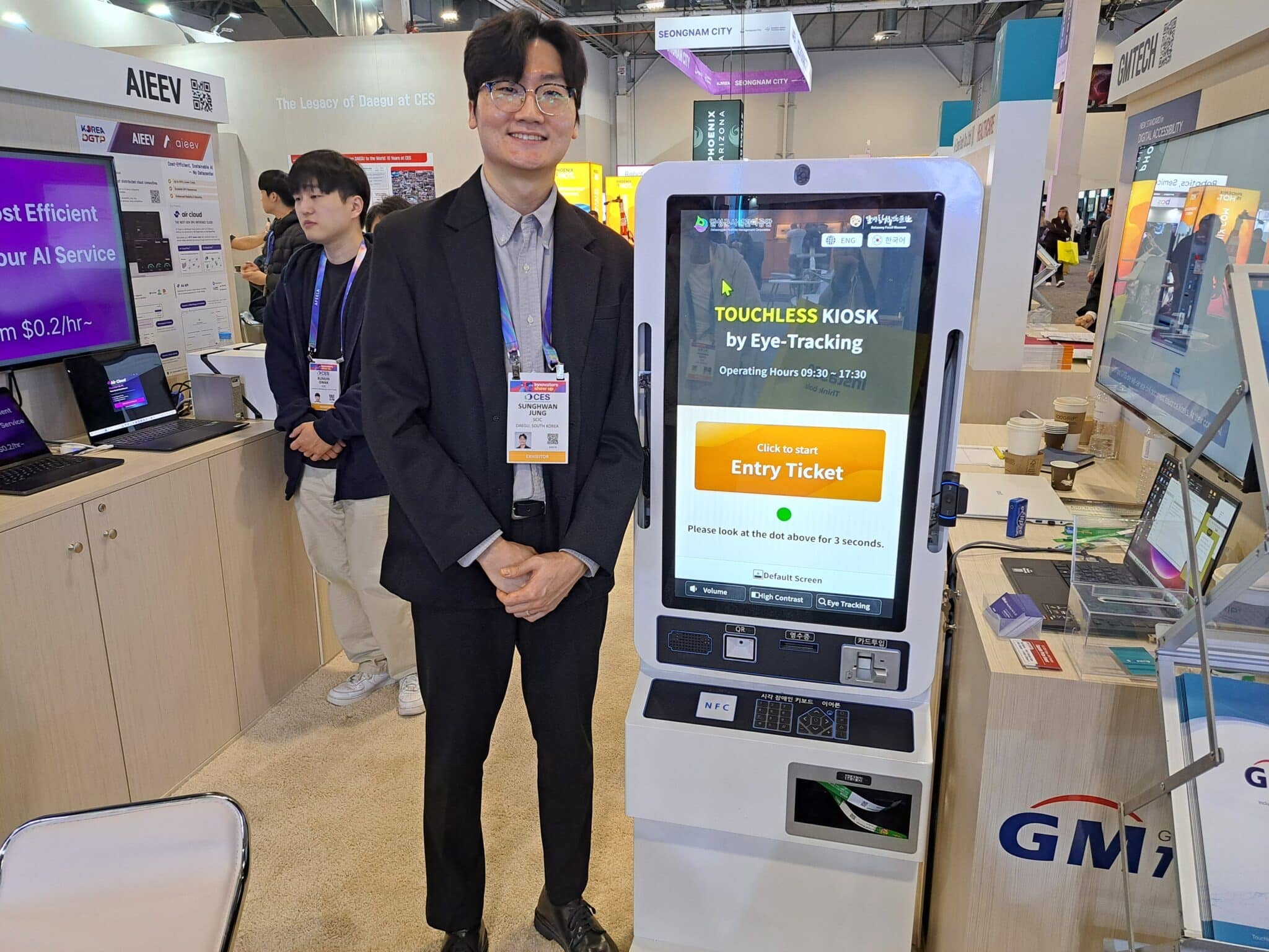 - Jeong Sung Hwan introduces the smart universal kiosk designed for people with disabilities, older adults and children at the Gwang Myung Tech Co. Ltd. exhibit.