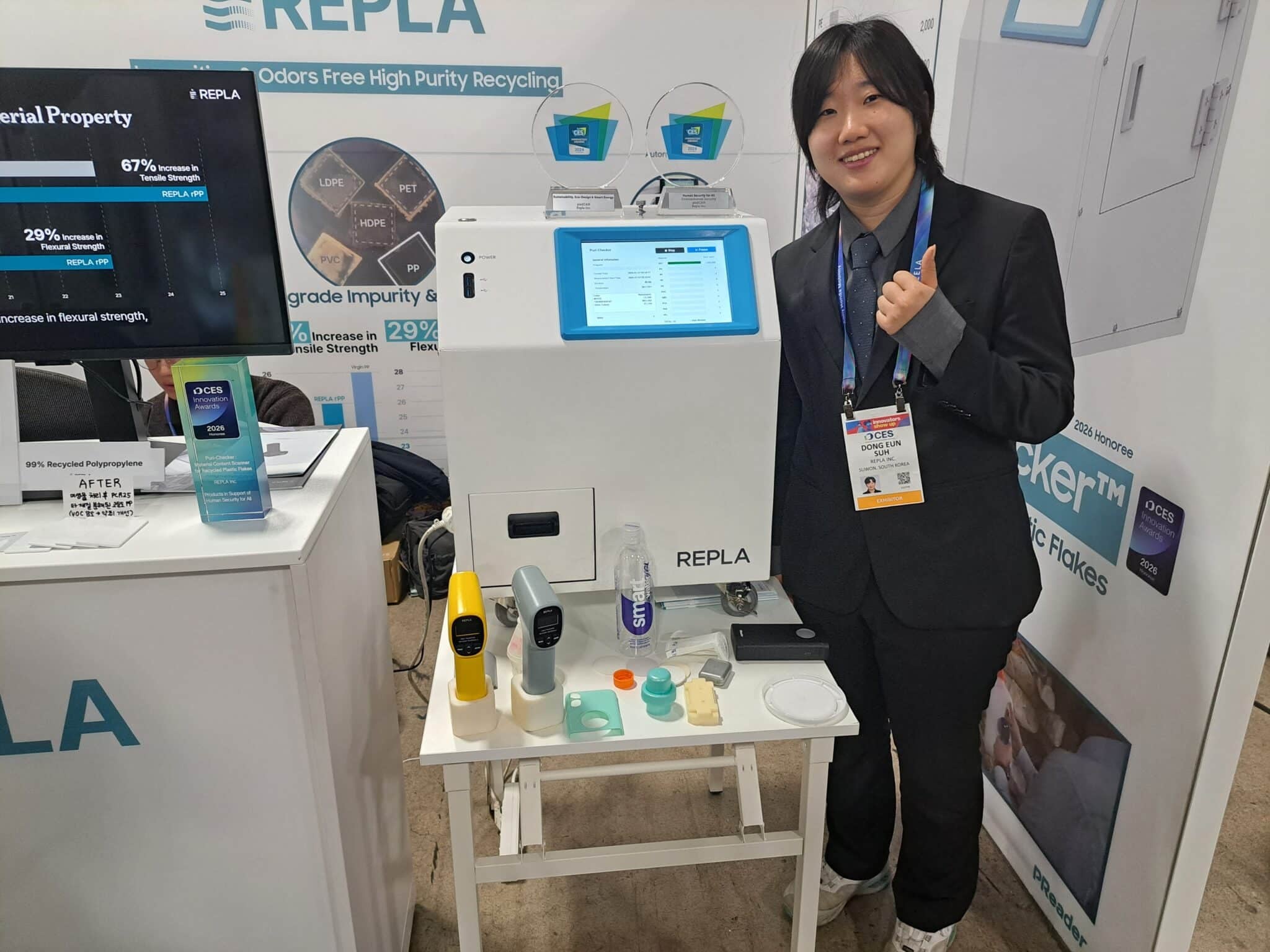- Dong Eun Shu presents the Puri-Checker material content scanner for recycled plastic flakes at the Repla exhibit.