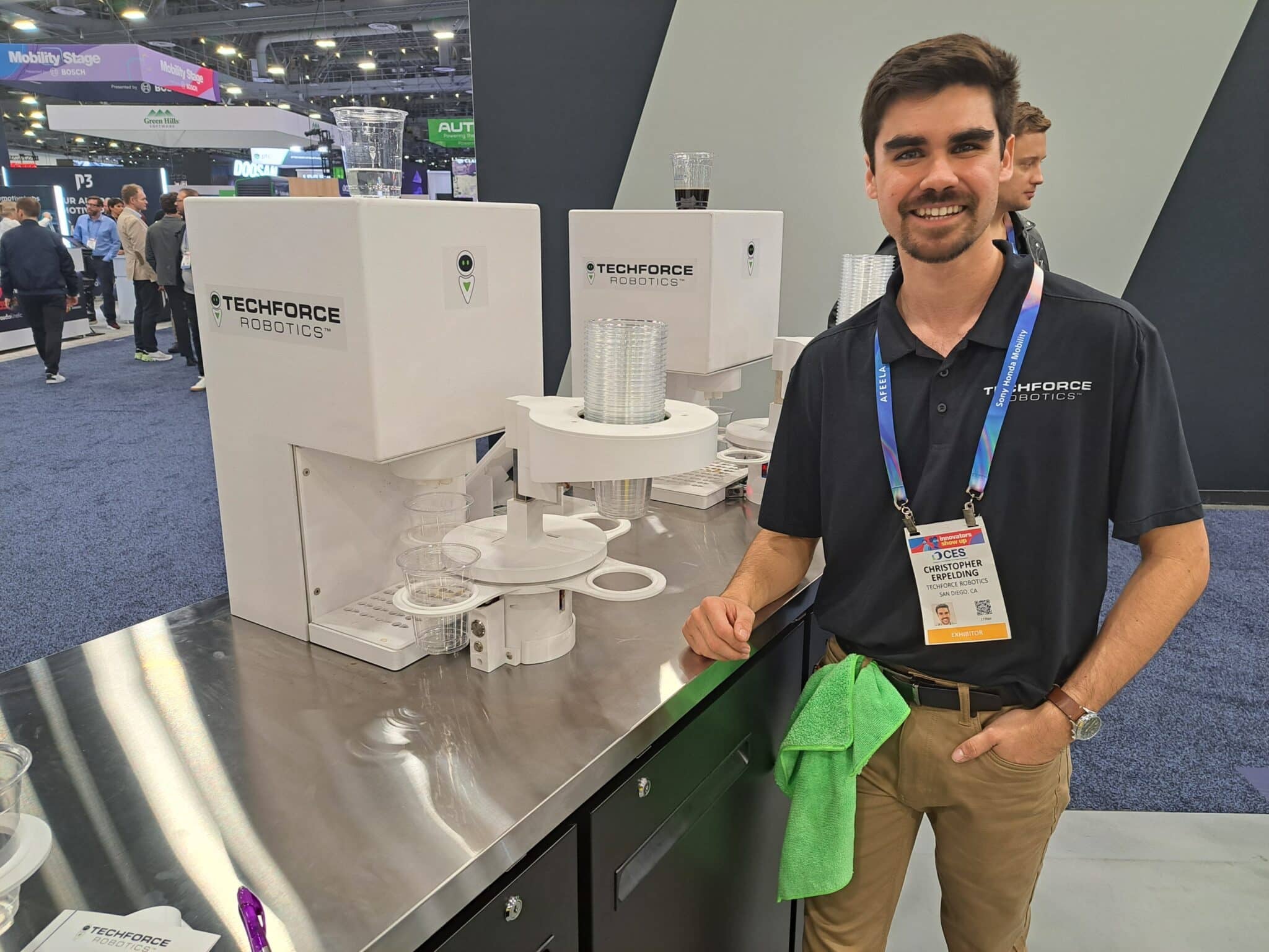 Techforce also demonstrated a countertop Beverage Bot dispensing machine that rotates four cups at a time. The system is engineered to dispense both carbonated beverages and multiple tap beer selections with precision, delivering cold beverages with minimal to no foam while preserving product quality and consistency.