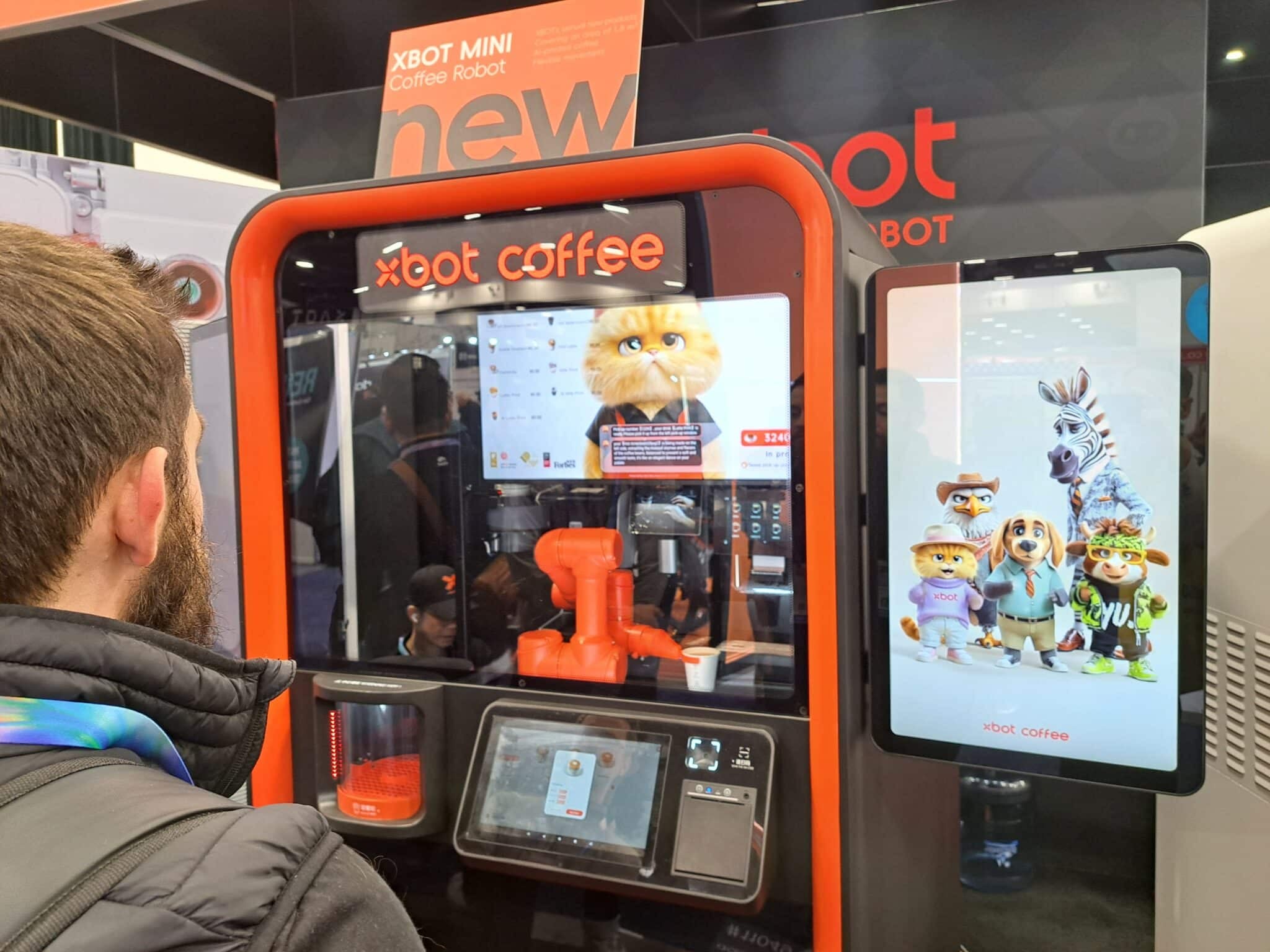 The Xbot automates cup handling, grinding, extraction, milk foaming, syrup dosing and serving, with some models handling up to 300 cups in eight hours and operating continuously.