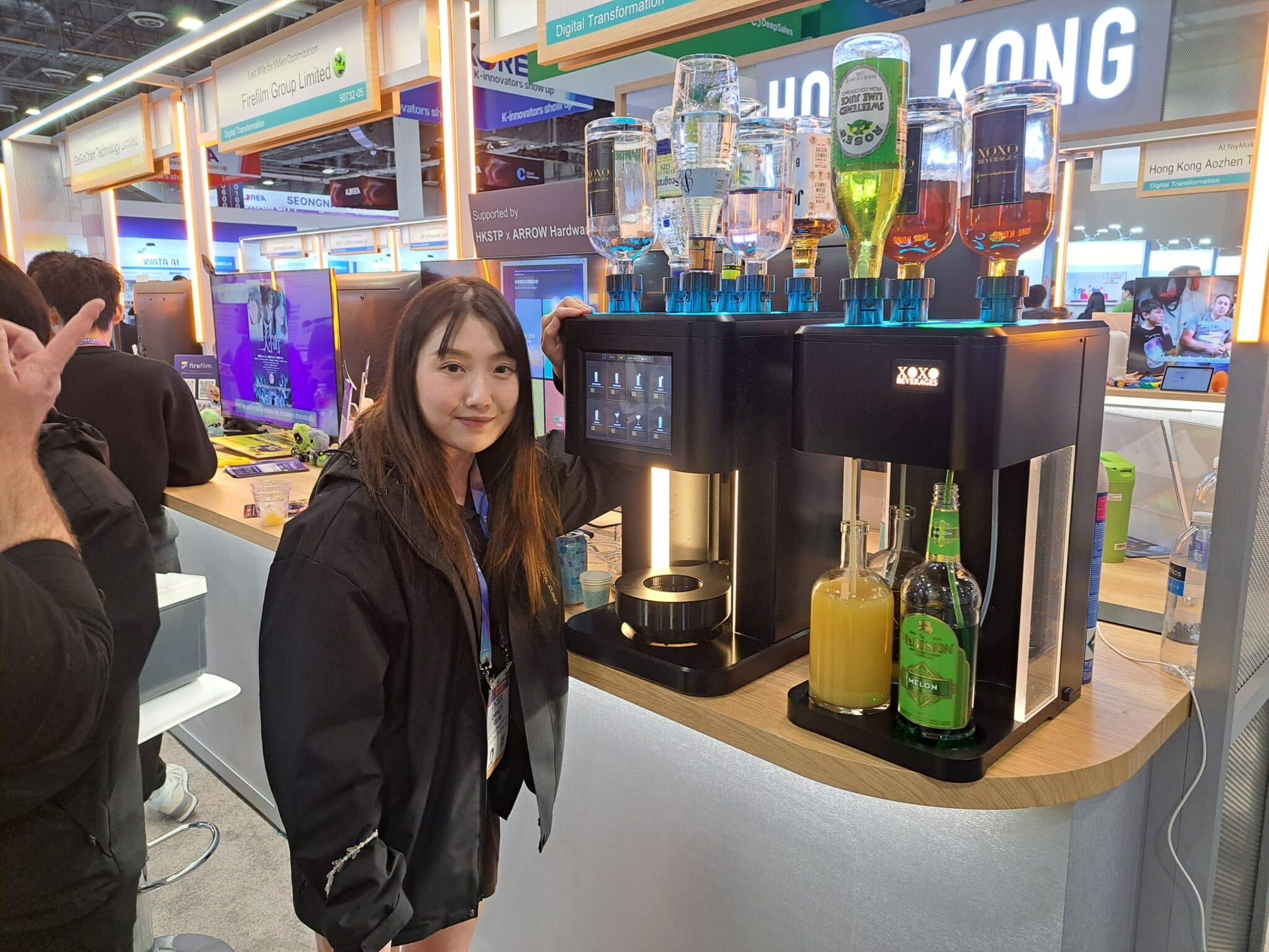 - Phoebe Yeung presents the automated cocktail-mixing machine at the XoXo Beverages exhibit.