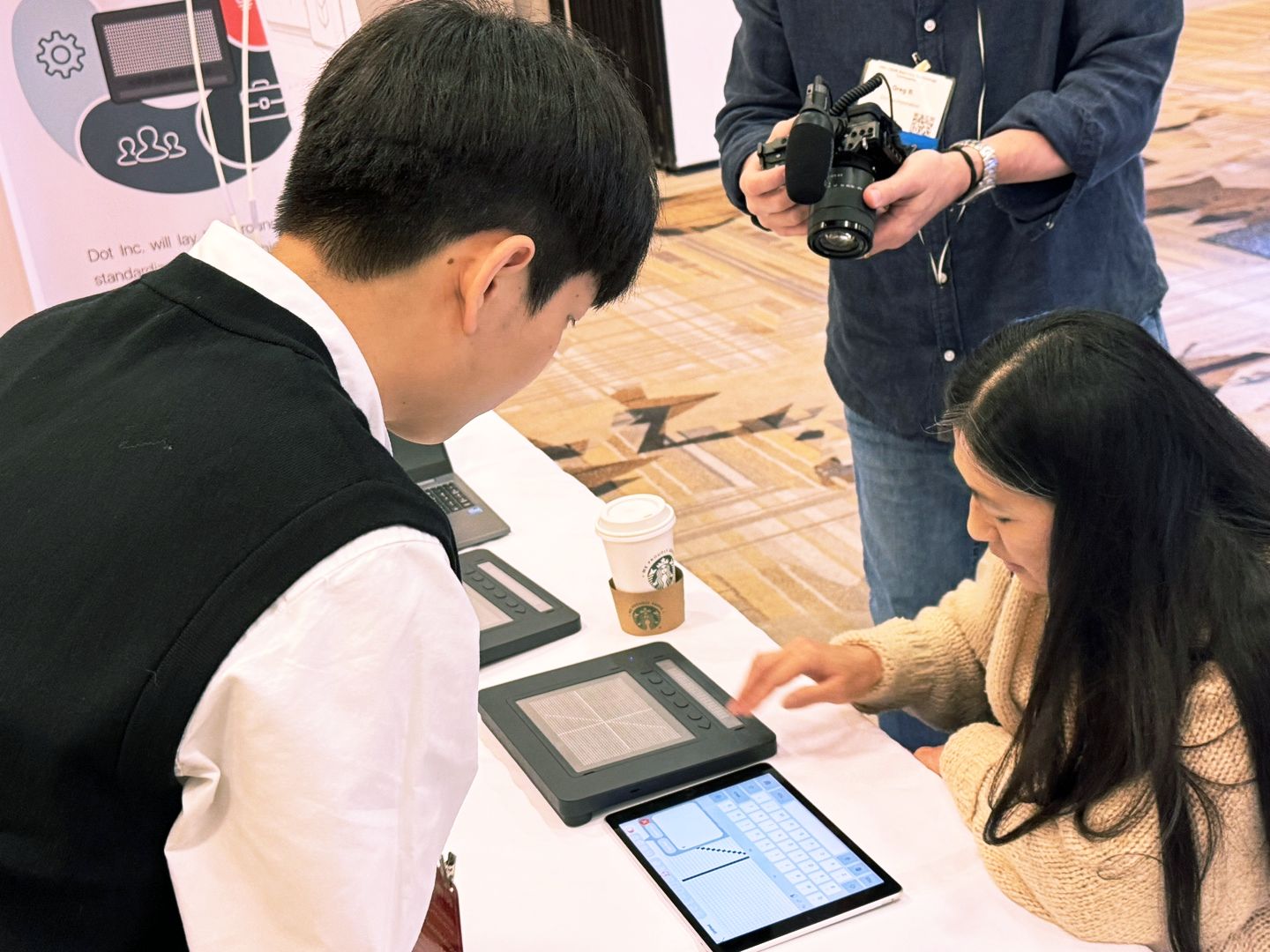 - A woman engages with a tactile display device on a table at the CSUN Assistive Technology conference, pointing to an adjacent tablet. A man looks on curiously while another person captures the moment with a camera. Nearby, a coffee cup rests quietly on the table.