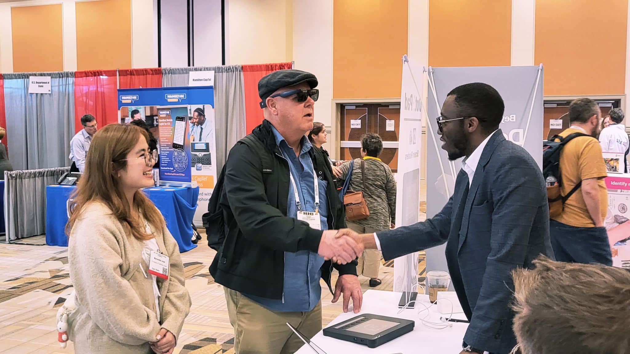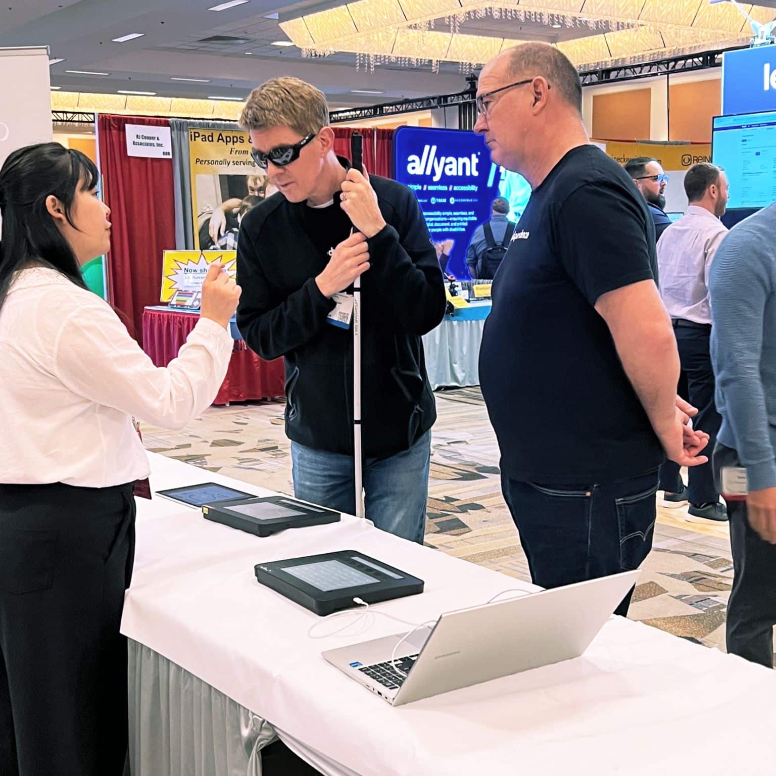 - Three people stand at a CSUN Assistive technology conference booth with tech devices on the table. A woman gestures while speaking to two men, one holding a white cane and wearing sunglasses. The background buzzes with banners and attendees.