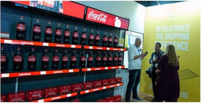 - A display shelf holds numerous Coca-Cola bottles next to Lenovo products. Three people are talking near a yellow wall adorned with Revolutionize the Shopping Experience, while digital signage enhances the kiosks modern allure.